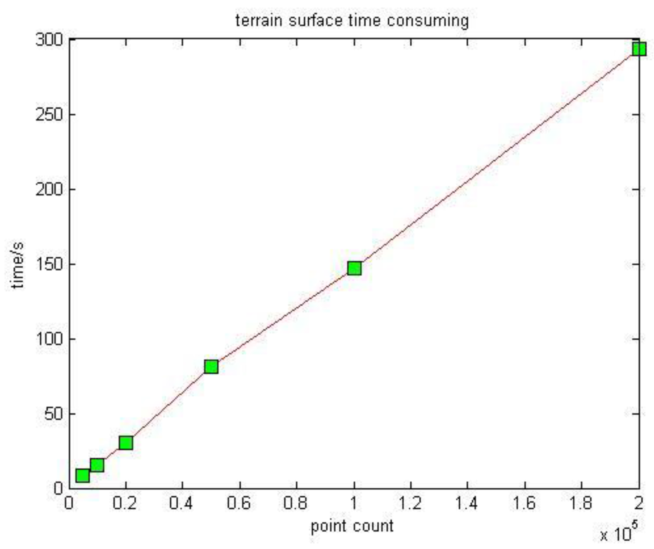 To the terrain surface construction part, we carried out the efficiency test of the through changing the DEM points. With the variation of the terrain points, the time to construct the terrain surface was recorded and the time to point count figure was drawn. It is clear in Figure 14 that the modeling time was linear dependent to the point count, which meant the algorithm was relatively stable when the DEM points were less than 200,000 (Table 1).