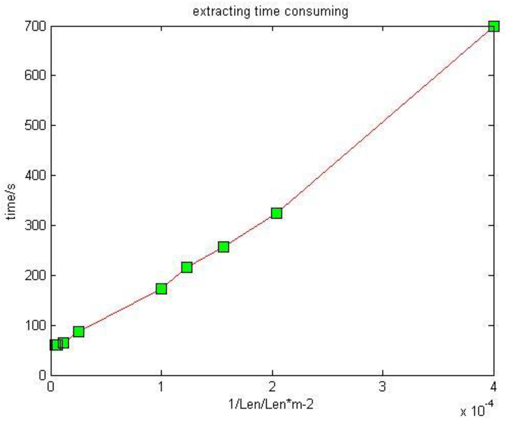 The time and reciprocal of the quadratic of the grid length was drawn in the Figure 15, which showed that the time was proportional to the reciprocal of the quadratic of the grid length. When the grid length increases, the point counts will increase not only in the X direction, but also in the Y direction. The direct ratio relation shows that the algorithm is stable (Table 2).