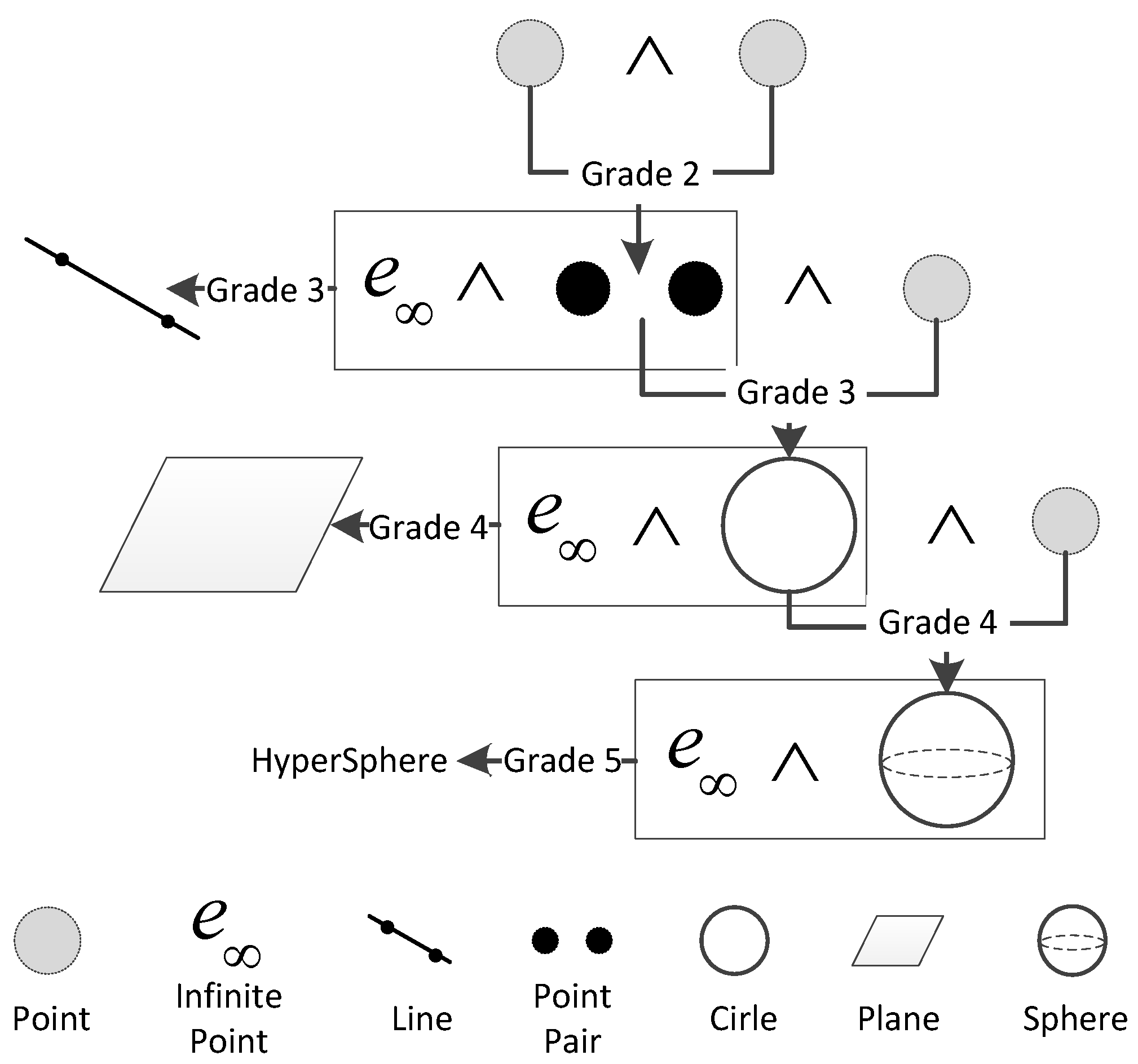 CGA is one of the most powerful geometric algebra (GA) systems. Compared with other geometric systems, such as Euclidean geometry and projective geometry, CGA has the unique advantages of simple and intuitive structure, distinct geometric meaning and unified characteristics with regard to the expression of the geometry [35,36,37,38]. Because dimensional and topological structures in CGA are consistent with the Grassmann dimensional structure, different dimensional elements can be expressed directly via outer products with conformal points. The structure of the Grassmann hierarchy is similar to the topological structures of different dimensional objects [39], which enables the construction of a unified representation for different dimensional geometries in CGA [40]. The unified representation of the geometric construction is purely algebraic, which indicates that geometric objects can be expressed as an algebraic entity [41]. With the expression of the structure of the geometric objects in CGA, the topological relations are implicitly contained in their algebraic expression [42]. In this manner, the unified representation of geometries and topological relations can be achieved.