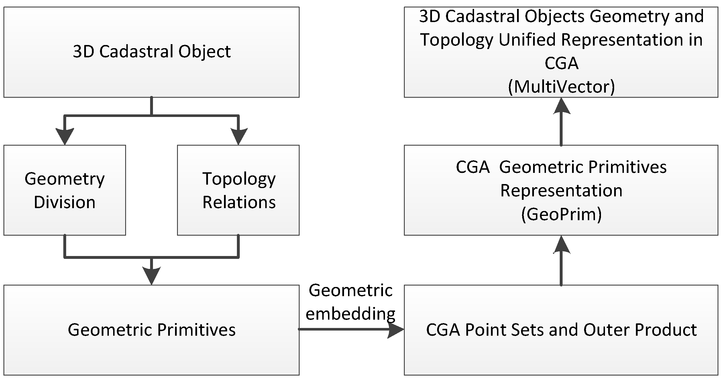 One of the main issues caused by the division of multidimensionality in EG space is the separation between the representation of geometry and the representation of algebra. Geometric elements with higher dimensions in EG space cannot be expressed directly and algebraically by their geometric components, which have lower dimensions. A separation exists between the expression of geometry and the expression of algebra [16], which produces the diversity of distinct expressions and computational structures in objects of different dimensions. EG-based 3D data models focus on the description of topological relations among different dimensional construction elements of 3D objects [7]. These methods for spatial representations are not intuitive. They cannot handle a complex hierarchical structure, especially the dimensional hierarchical structure in a 3D cadastre as an entity. Topological relations among different dimensions, such as points, boundary lines, boundary faces and spatial units, are commonly employed to indirectly realize the spatial representations of 3D objects [17,18,19,20]. For instance, lines and surfaces are expressed by the descriptions of construction points and lines, respectively, whereas a 3D spatial unit is represented by recording of relative surfaces. The principle of EG-based data models is a 3D extension of the topological relations among points, lines and planes in 2D space. In these data models, the geometries only comprise symbols that are logged or described in the database instead of the real computational primitives that are represented algebraically. The topological relations in EG-based data models resemble the connection structures between these symbolized geometries [21,22,23]. Due to the complexity of 3D objects and the limitations of EG in complex 3D object representation, EG-based data models cannot realize the integration of geometry and topology as an entity. Although several studies have attempted to integrate geometry and topology [24,25,26], none have achieved this goal due to the limitation of EG. New mathematical theories are needed to integrate geometric and algebraic representations as an entity.