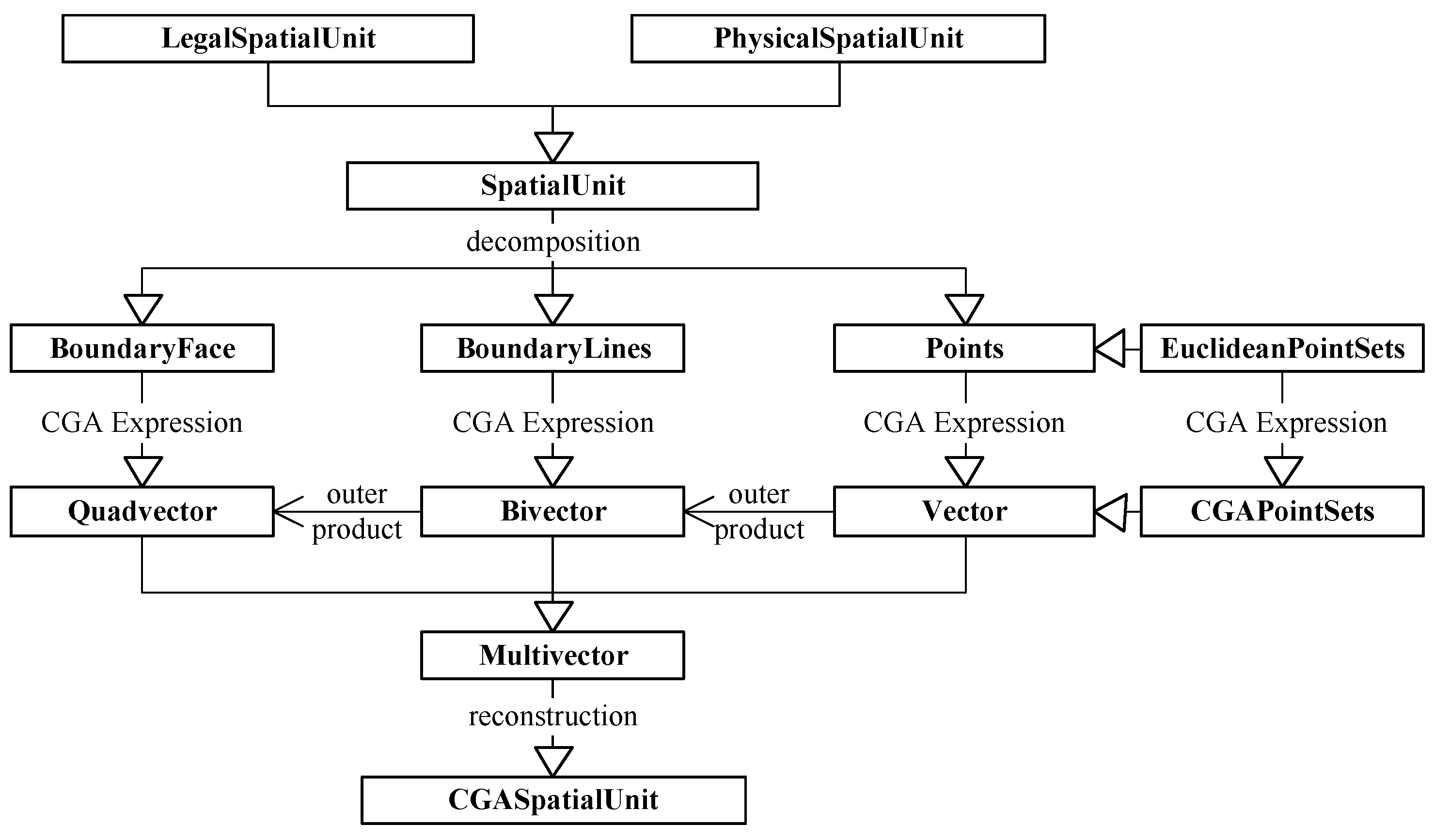 This section introduces a detailed description of the expression method of 3D cadastral objects in CGA. First, the relationship between the main research contents and the land administration domain model (LADM) [45] is discussed. Second, the concept and scope of a 3D cadastral spatial unit are defined as semantics. Third, a method to realize a unified multidimensional expression of geometry and topology for 3D cadastral objects, which is based on CGA, is introduced. We obtained a 3D cadastral spatial unit from the abstraction of both the legal and physical levels of the 3D cadastral objects. The 3D cadastral spatial unit is decomposed to obtain a series of geometric simplexes, which can be represented by different dimensional blades in CGA. To achieve the multidimensional expression for the complex 3D cadastral spatial unit, the multivector, which is a spatial mathematical structure in CGA, is employed. The 3D cadastral data model, which is based on CGA, is shown in Figure 3. Last, the structure of 3D cadastral spatial unit data storage organization in CGA is designed.