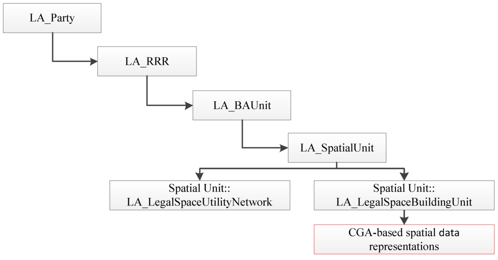 Figure 4: a party (LA_Party); rights, restrictions, responsibilities (LA_RRR); a basic administrative unit (LA_BAUnit); and a spatial unit (LA_SpatialUnit). The main research contents of this paper belongs to the spatial unit in the LADM. It is primarily based on CGA theory to investigate data organization and the relationship between geometry and topology, which is integrated in the expression for 3D spatial units. The construction of a 3D cadastral data model that is based on CGA is an extension of the spatial units in the LADM. The relationship between the CGA-based data model and the LADM is depicted in