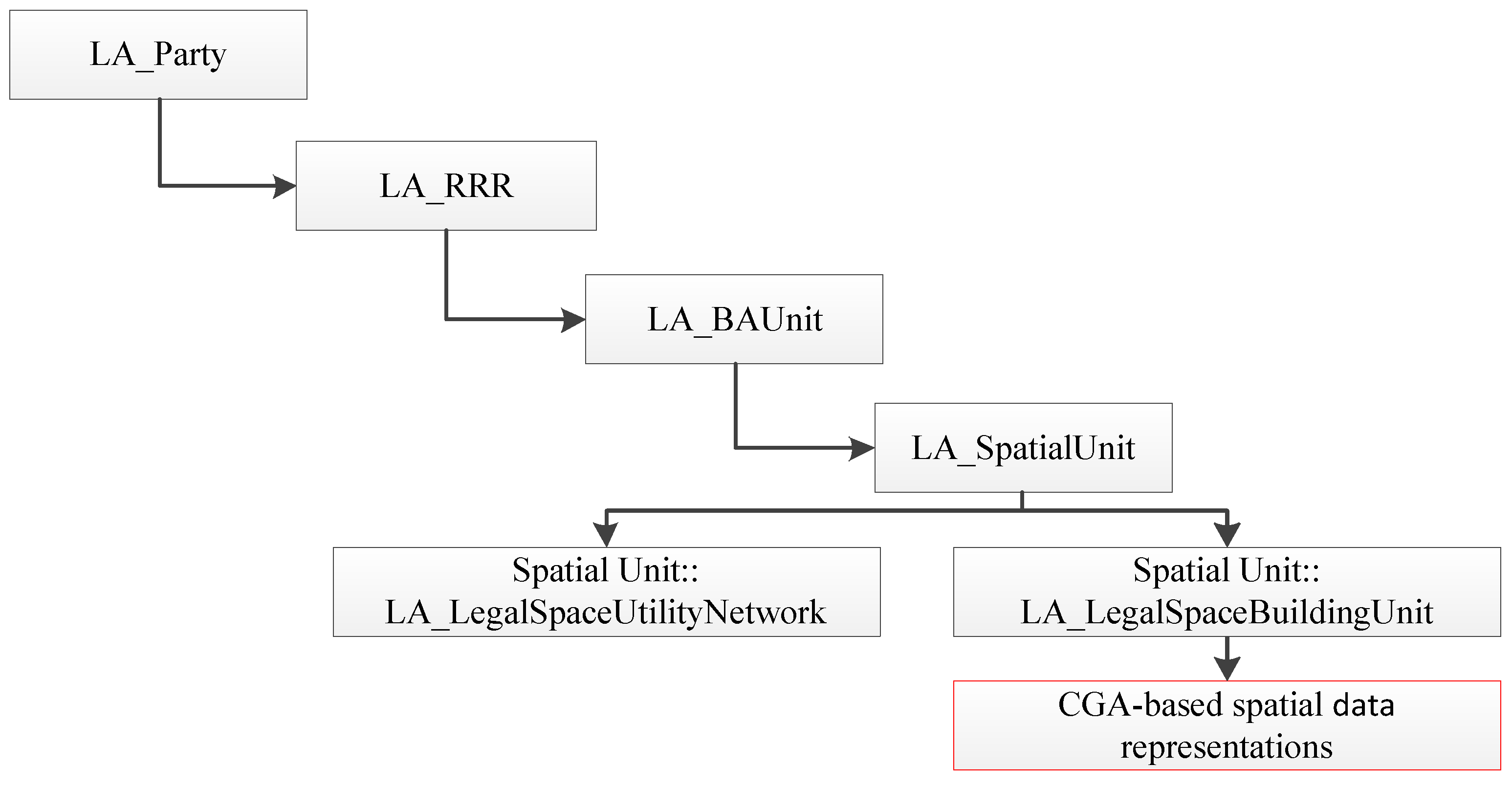 The Land Administration Domain Model (LADM), which includes a 3D cadastre, is a conceptual model for cadastral management [46]. The LADM has obtained the certification of the International Organization for Standardization (ISO). The LADM contains four parts, as shown in Figure 4: a party (LA_Party); rights, restrictions, responsibilities (LA_RRR); a basic administrative unit (LA_BAUnit); and a spatial unit (LA_SpatialUnit). The main research contents of this paper belongs to the spatial unit in the LADM. It is primarily based on CGA theory to investigate data organization and the relationship between geometry and topology, which is integrated in the expression for 3D spatial units. The construction of a 3D cadastral data model that is based on CGA is an extension of the spatial units in the LADM. The relationship between the CGA-based data model and the LADM is depicted in Figure 4.