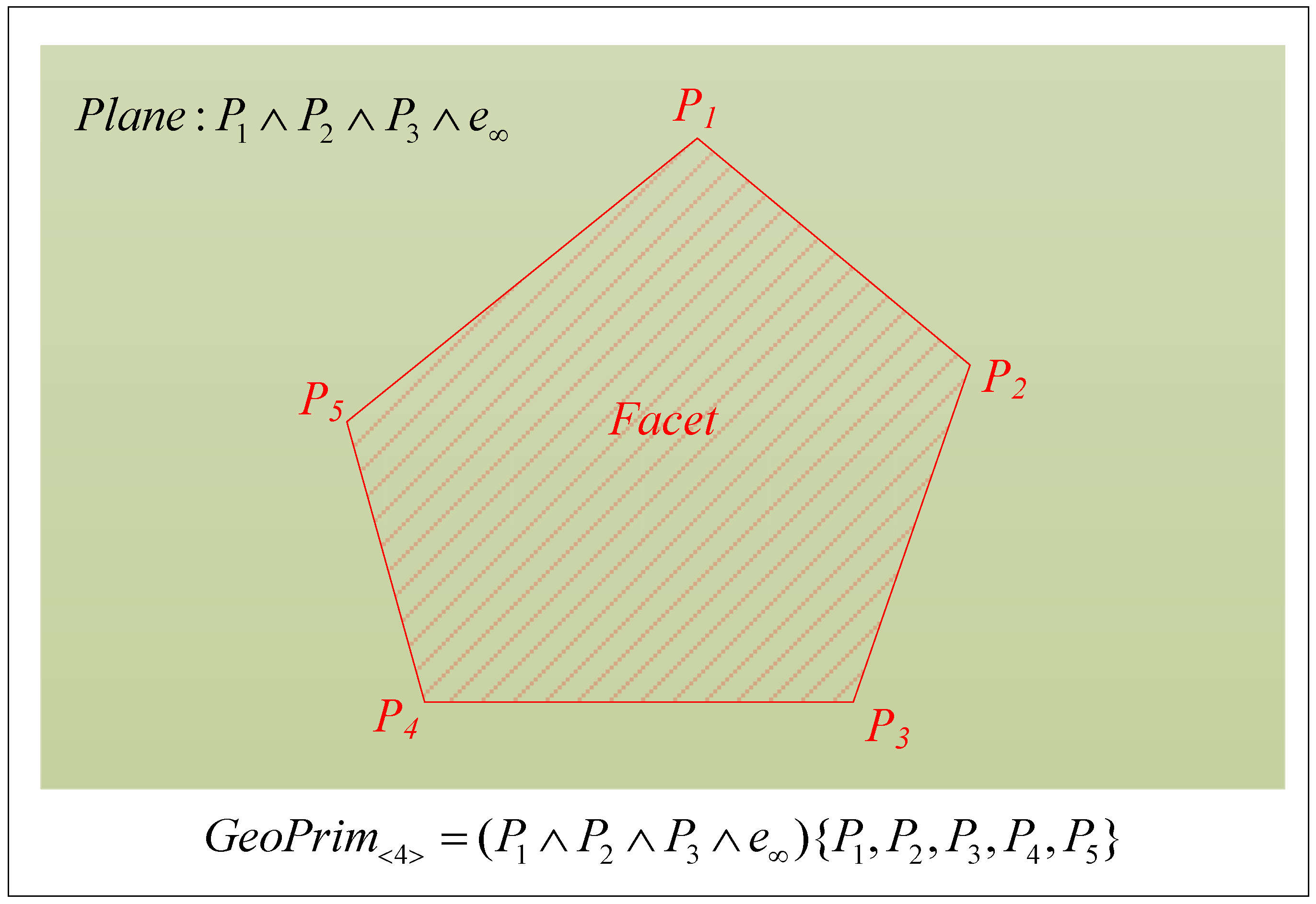 Consider a primitive facet that is composed of five points, as shown in Figure 5. The plane that contains the facet in can be represented by , whereas the boundary of the facet is restricted by the five composing points. Figure 5 and the definition of indicate that the basic geometric simplexes are directly represented by the outer product of conformal point sets. The geometric ranges of these simplexes are restricted by the sequence of point sets that compose the corresponding boundary simplexes. In this manner, we realize the accurate and united representation for different dimensional simplexes in CGA. Complex geometric objects in CGA can be expressed by integrating different dimensional simplexes. To realize the expression of complex 3D cadastral objects as an entity, the mathematical structure of a multivector in CGA is employed to realize the unified expression of multidimensional simplexes, which is defined as follows: