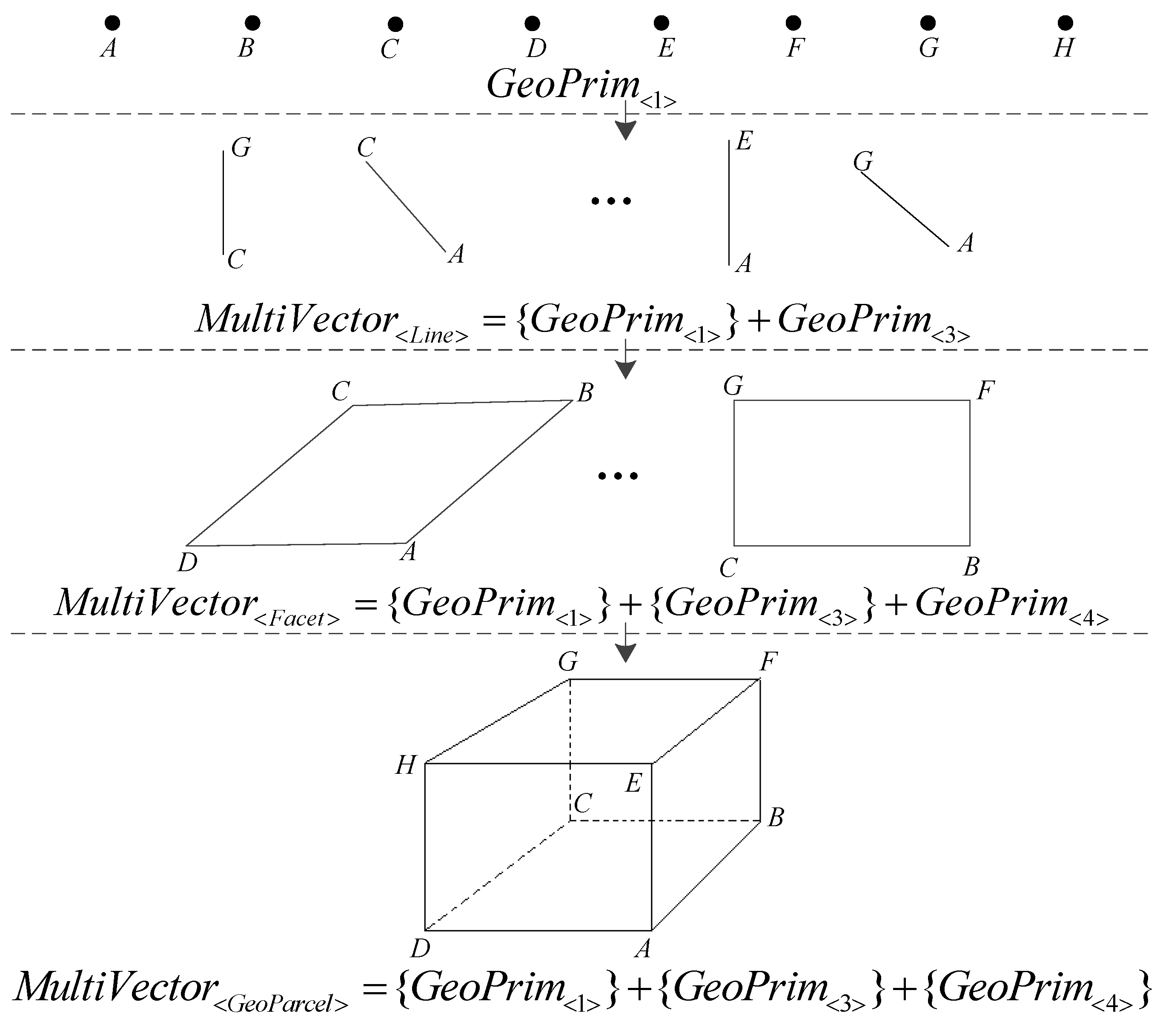 Fundamental primitives (e.g., points, point pairs, lines, circles, planes and spheres) in CGA can be represented consistently using the outer product with the integration of geometries and topological relations. However, the representation of arbitrary geometries may not fit a hierarchal Grassmann structure. To ensure compatibility with an existing GIS data model, a 3D cadastral data model with a complex-simplex structure is formed. For example, complex geometries should be composed of elementary geometries. In this combination, topological structures should also be encoded and represented in the expression of geometric structures. Although CGA includes six primitives, only points, lines and planes are employed in the spatial representations to fit the characteristics of accurate cadastral boundary representation. Because the elemental geometric objects in CGA have different dimensions, a unified representation structure that represents different dimensional objects is preferable.