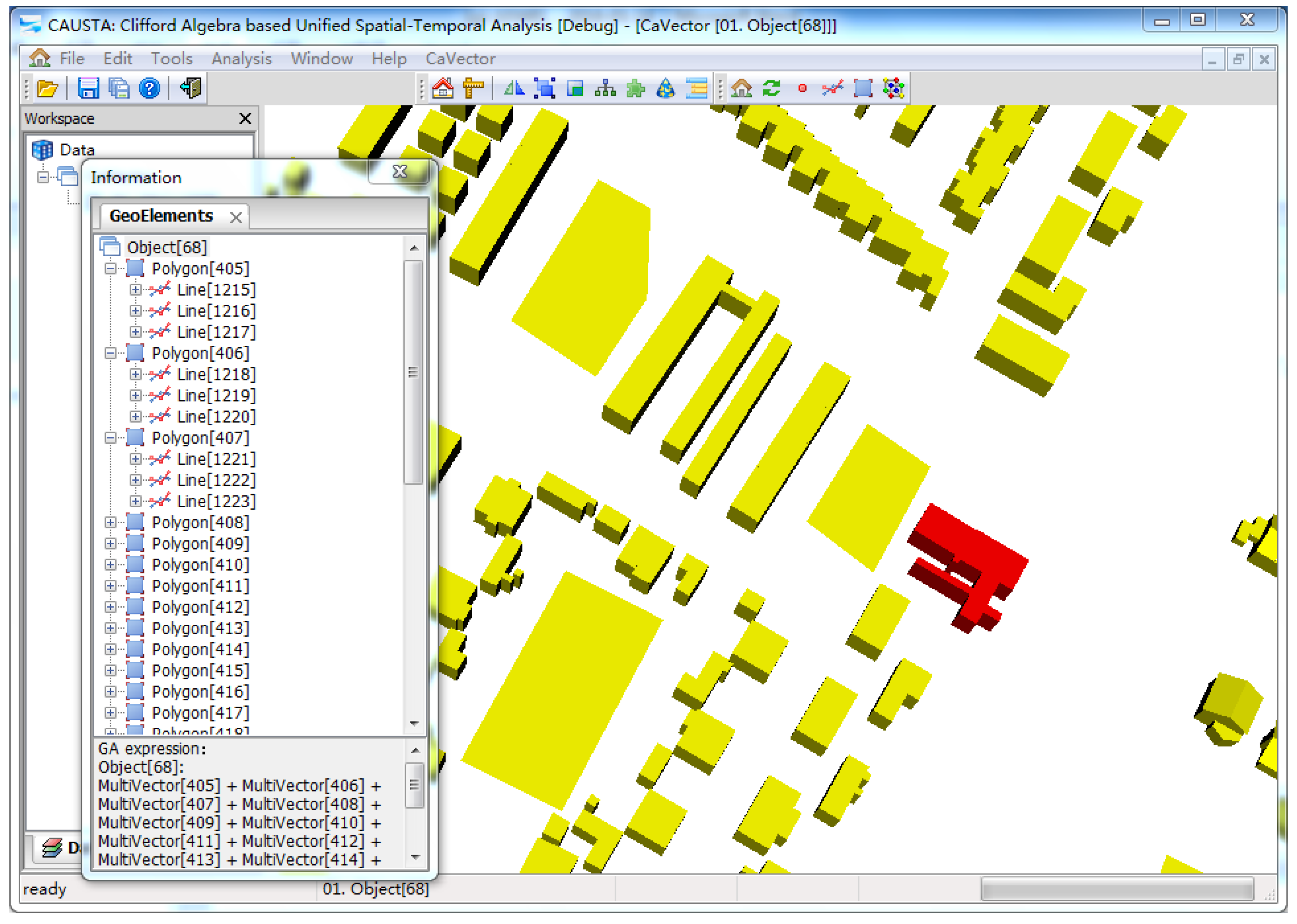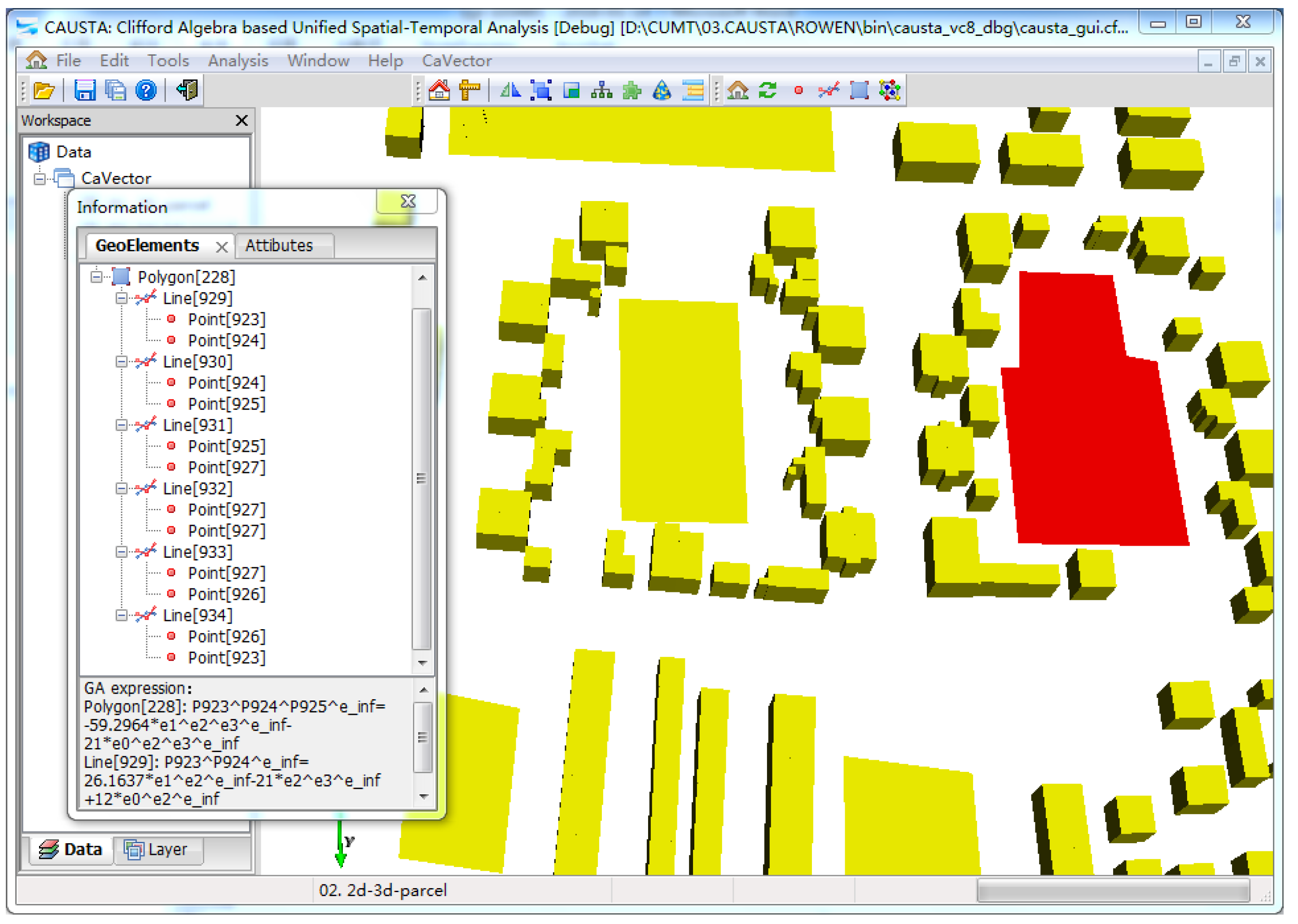Cadastral data for an urban residential community in Xuzhou, Jiangsu province, are selected as the experimental data in our case study. The experimental data includes 17,618 points, 28,487 boundary lines, 9,462 boundary faces and 1,484 buildings. These building models are imported into the software system CAUSTA [32]. The data model is implemented as a plug of the system CAUSTA. To ensure compatibility with GA-based operations, the experimental data are reorganized in CaVector data formats for the storage structure. The storage structure is subsequently assembled according to the multivector structure. With these transformations and organizations, we can manage the 3D cadastral spatial units in CAUSTA. The demonstrations are performed in the hardware environment of a Lenovo E420 notebook with a 2.4-GHz Intel Core i5-2430M CPU and 4 GB of RAM. The software environment is a Windows 7 operating system with Visual Studio 2008.