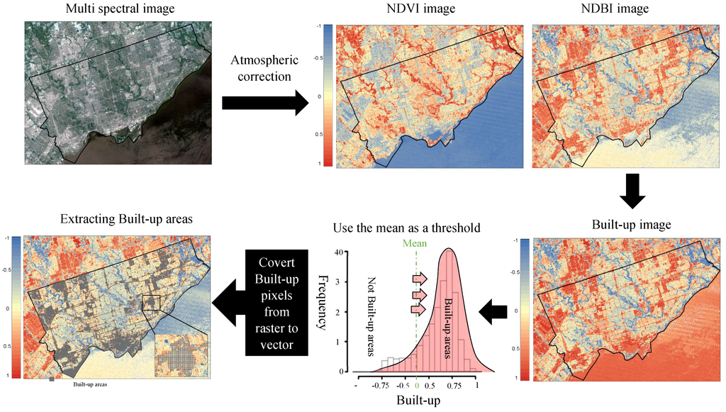 The same concept as in Zha et al. [22] is considered, where the positive values obtained from Equation (3) represent built-up areas, or otherwise, they refer to non-built-up areas. After that, only those built-up pixels with high positive values were used. Higher positive built-up pixel values were identified based on the histogram of the built-up image. The mean of the histogram of the built-up image was used as a threshold to identify those high values [25]. These selected positive built-up pixel values were then converted into polygon shapefile layers for further analysis in ArcGIS. The following Figure 2 shows a pictogram to demonstrate how the built-up area is derived.