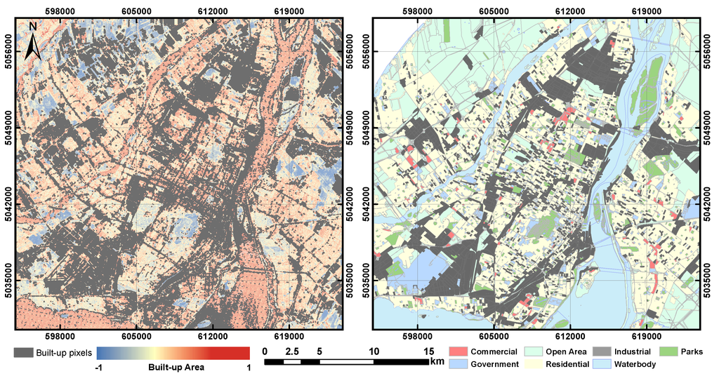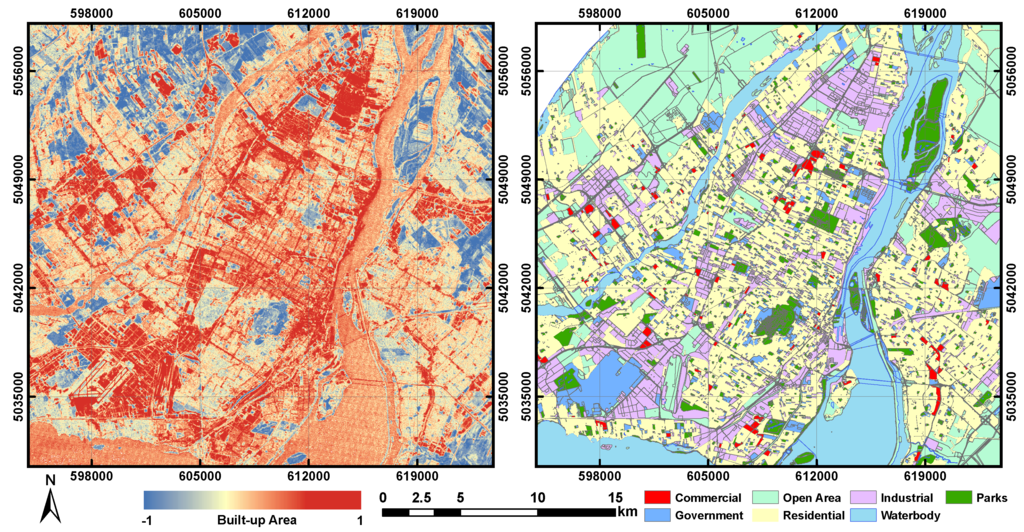 Landsat derived built-up image (left) and land use map (right) for the City of Montreal.