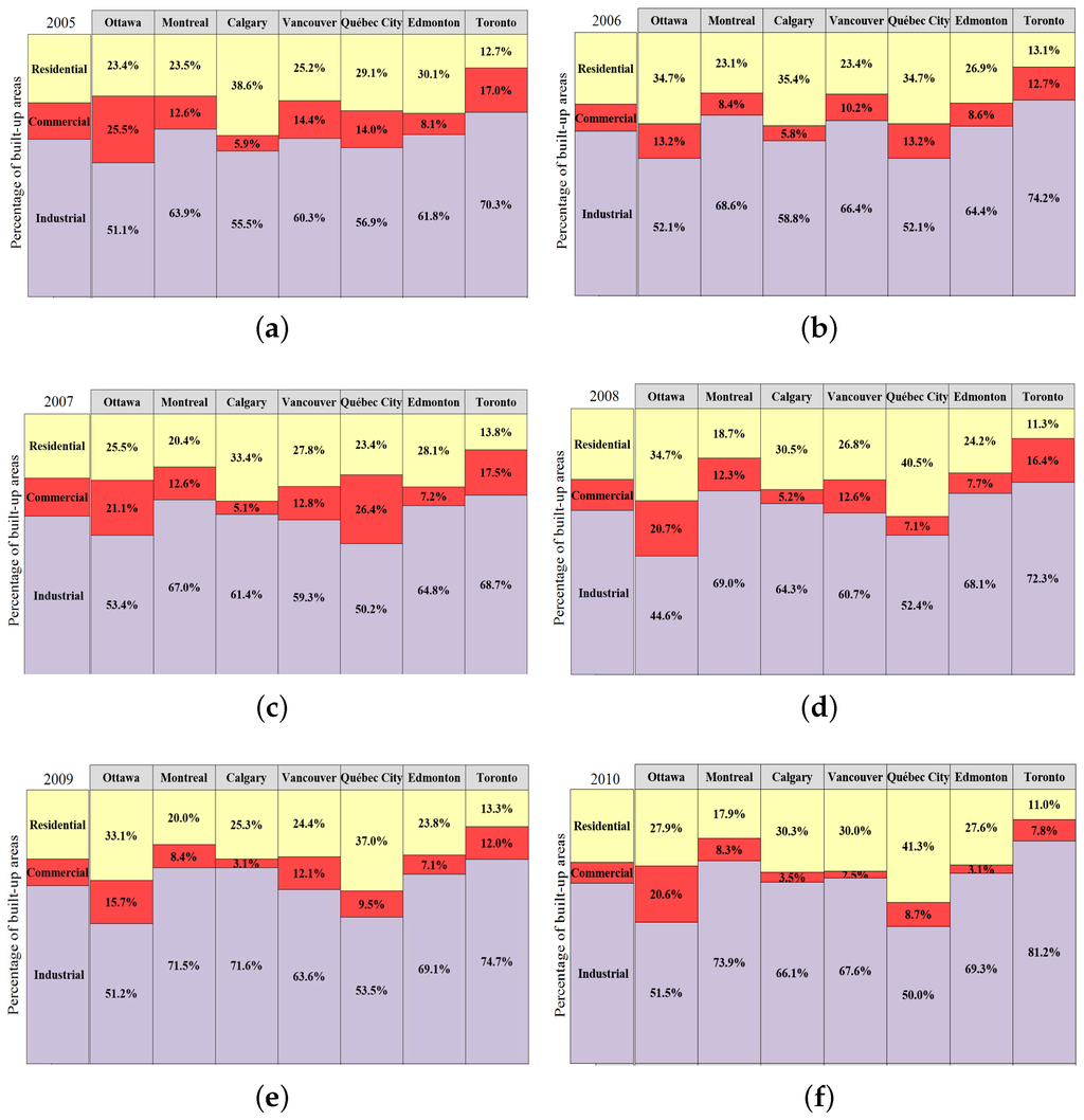 Figure 5 shows dramatic changes in the percentage of the built-up areas that are located within the residential and commercial areas in the cities. The percentage of the built-up areas that are located within the residential and commercial areas in Québec City and Ottawa changed from 4.5% to 12% throughout 2005 to 2010, which could be explained as due to the urban sprawl in those two cities. However, the industrial areas in the other cities, such as Toronto, Montreal, Vancouver and the City of Calgary, expanded by 7% to 10% from the year 2005 to 2010. This can be explained by the urban expansion in the industrial sector that is more than the residential and commercial sector in these four cities.