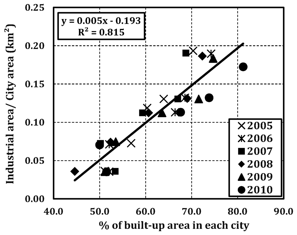 Relationship between the percentage of built-up areas and the industrial areas from 2005 to 2010.