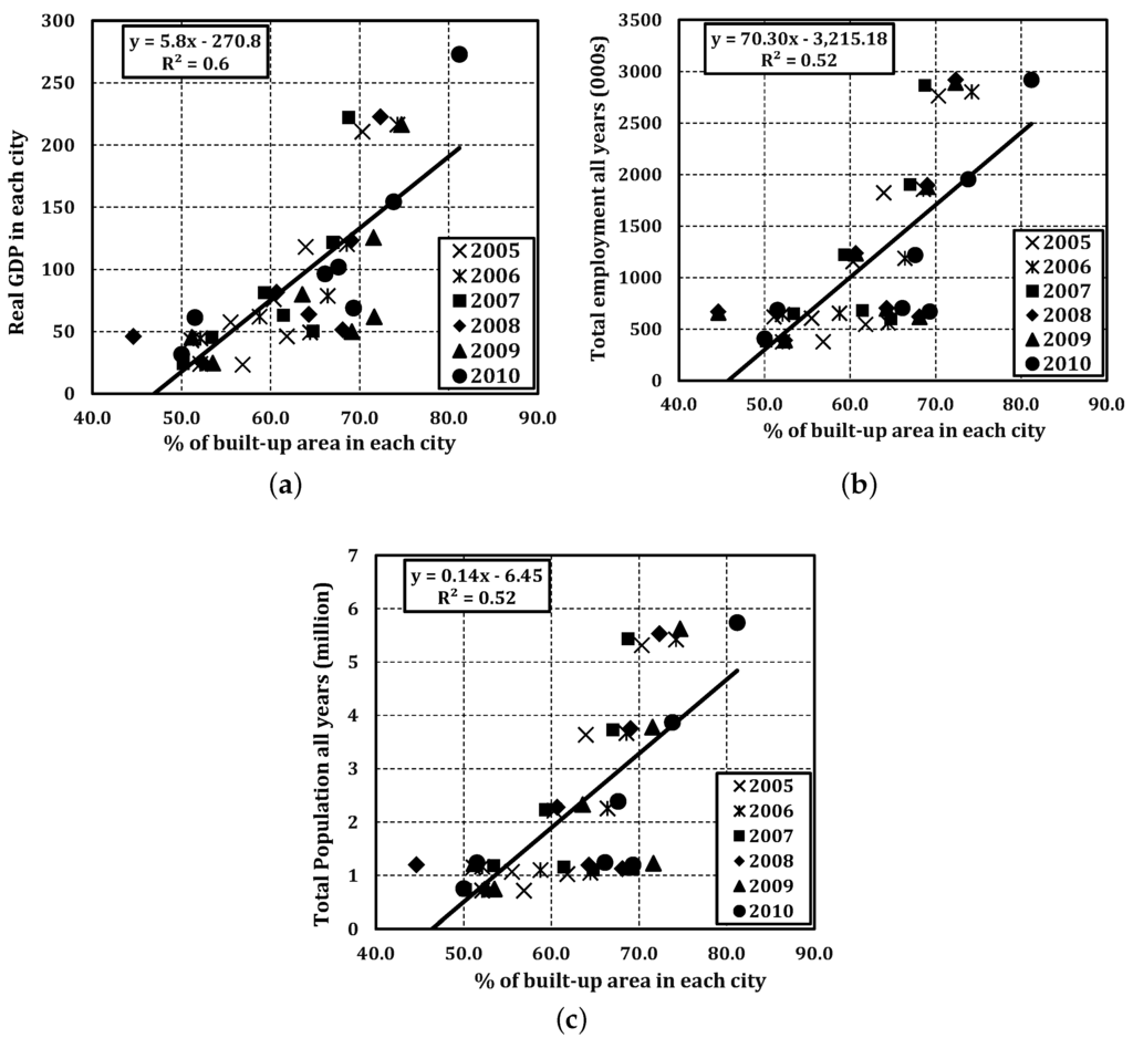 Figure 7 shows the relationship between the percentage of the built-up areas within the industrial zones and the real GDP, total employment and total population from 2005 to 2010, respectively. Preliminary analysis revealed that a moderate positive linear relationship exists for both of the socio-economic parameters and the percentage of the built-up areas within the industrial zones from 2005 to 2010. An R2 of 0.6 was detected for the percentage of the built-up areas within the industrial zones and real GDP. On the other hand, an R2 of 0.5 was observed for the percentage of the built-up areas within the industrial zones and total population. Furthermore, the linear regression between the percentage of the built-up areas found within the industrial zones and R2 of total employment was 0.5.