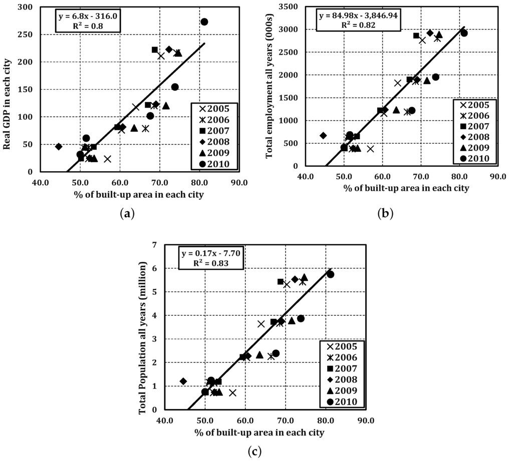 Finally, the social-economic data obtained from the Metropolitan Housing Outlook [9], including the real GDP, the total employment and the total population for the seven cities, were plotted and analysed in the GIS platform. Finally, the built-up areas extracted from the Landsat images were correlated with the three socio-economic parameters in order to reveal their relationships. The linear regression analysis was used to depict the relationship between any two parameters, and in this study, we used the R2, i.e., the coefficient of determination, as an indicator to reveal the relationship between any of these two parameters. A confidence interval of 95% was used throughout the linear regression analysis.