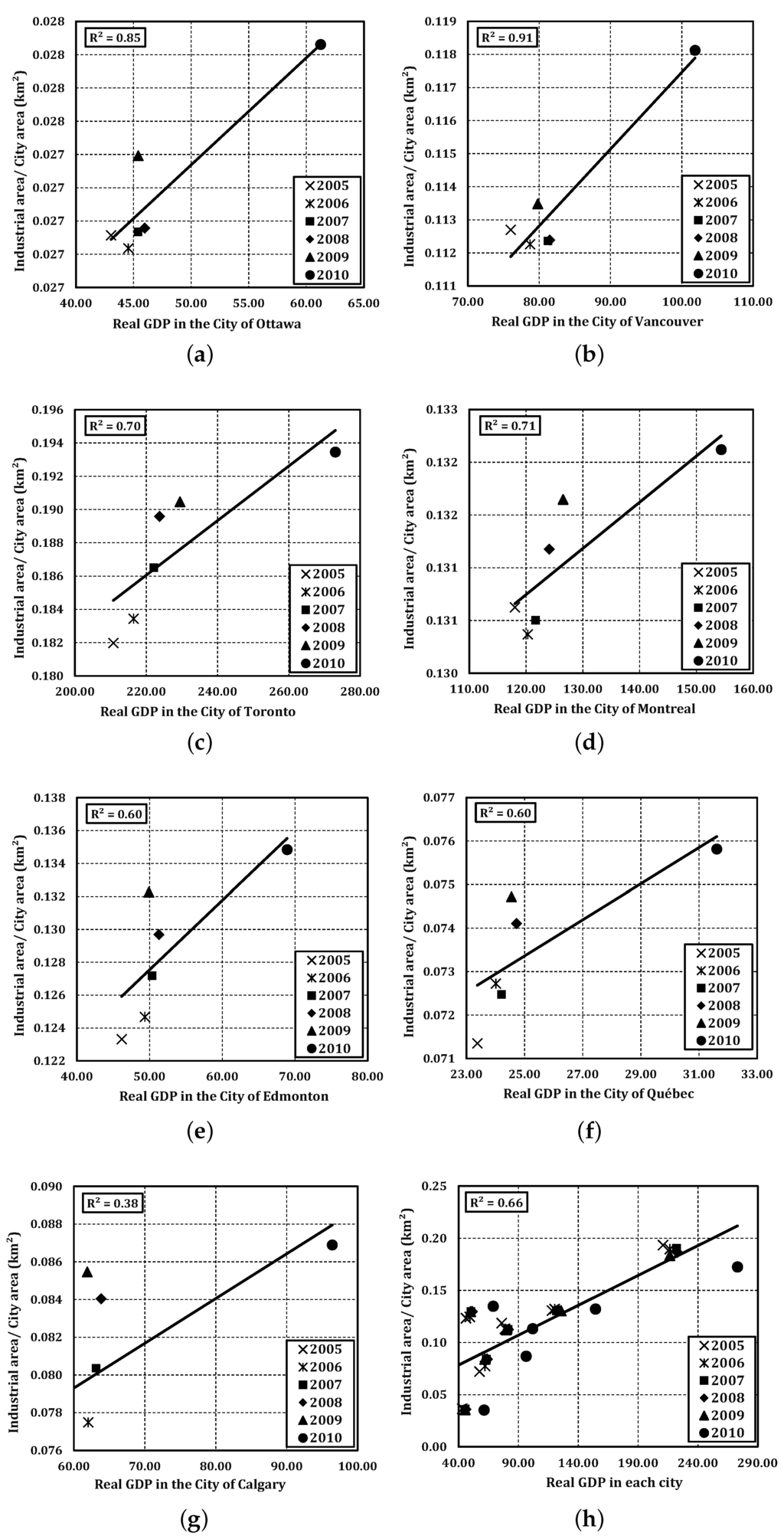 Relationship between the real GDP and industrial areas from 2005 to 2010. (a) City of Ottawa; (b) City of Vancouver; (c) City of Toronto; (d) City of Montreal; (e) City of Edmonton; (f) Québec City; (g) City of Calgary; (h) all cities.