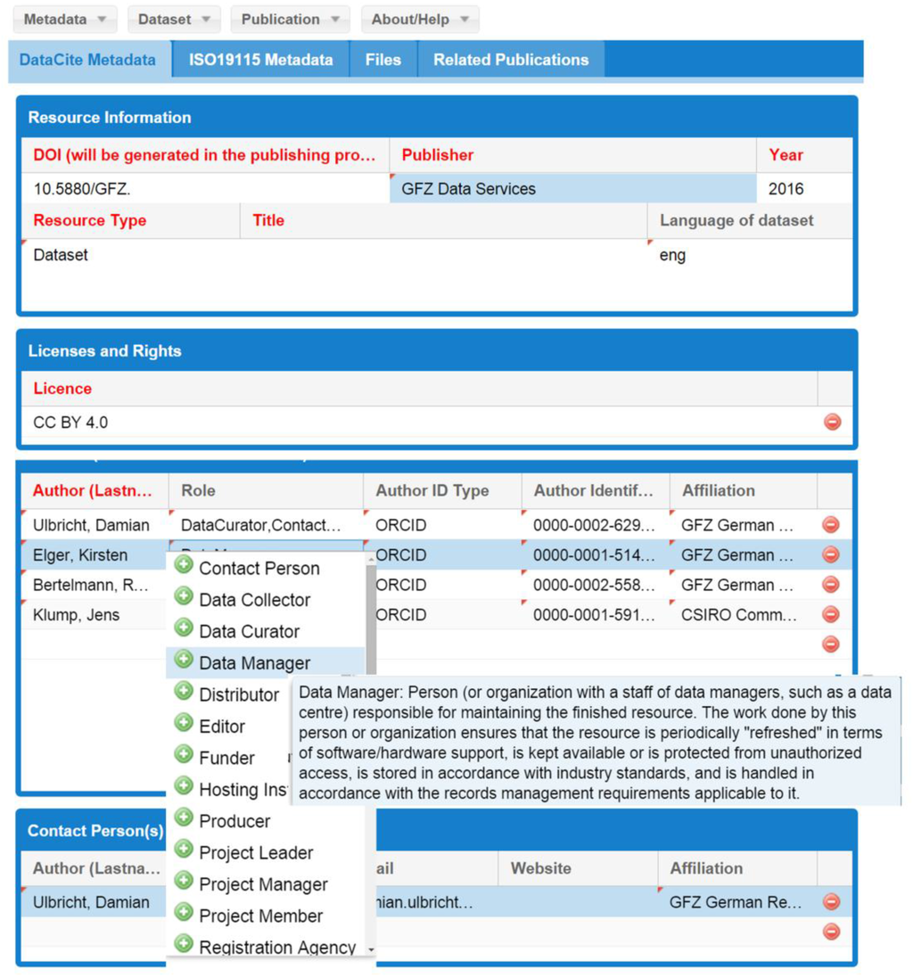 Figure 2 shows the graphical user interface (GUI) of the JavaScript metadata editor [38] that has been developed to create standardised metadata for data discovery, which is the base for the DOI registration. The scientist may enter the metadata into the form, save an XML file on its local drive, load XML files into the editor, and submit the final version to GFZ Data Services. Here, additional functions, like the DOI registration and synchronisation with panMetaDocs and eSciDoc, are possible after a review of the metadata. The metadata editor is a stand-alone application that can be used without panMetaDocs or eSciDoc. This allows the submission of metadata by the scientists themselves. In addition, external users, e.g., project partners, needed a way to provide metadata without logon to the eSciDoc system.