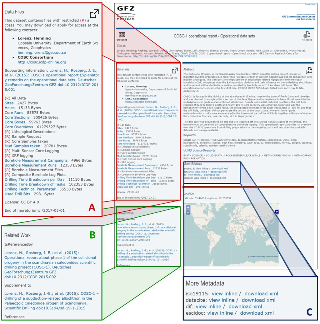 A DOI landing page generated by XSLT stylesheet transformation of an eSciDoc item (example from the International Continental Drilling Program [41]). Highlighted are information about the data files, contacts, and download restrictions (A), linked articles and linked datasets (B), and download links for the metadata in different metadata schemas (C). In this example, the data files are partly open access and directly downloadable via the landing page (file size is indicated), while other data files have restricted access for a defined embargo period (marked red R). The map data are © OpenStreetMap contributors and published under a CC-BY-SA license.
