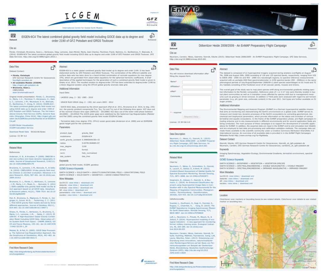 The clear and user-friendly presentation of datasets is an additional challenge for the creation of landing pages, as generated data differs not only in file formats but also most notably in the research-domain specific metadata for reuse. This is especially relevant for the highly diverse GFZ data of different scientific disciplines, and led to the development of discipline-specific DOI landing pages. This is mainly achieved by the reduction of information to the relevant elements for each discipline and is improving the usability and re-use of published datasets. A global gravitational model published via the International Centre for Global Earth Models [39], e.g., does not require a map (Figure 4), whereas maps with multiple bounding boxes are essential for the presentation of hyperspectral flight campaigns with associated field observations within the German Environmental Mapping and Analysis Program (EnMAP [40], Figure 4). Nevertheless, the standardised metadata for data discovery is always collected and available for download and inline view on the landing page (Figure 3C).