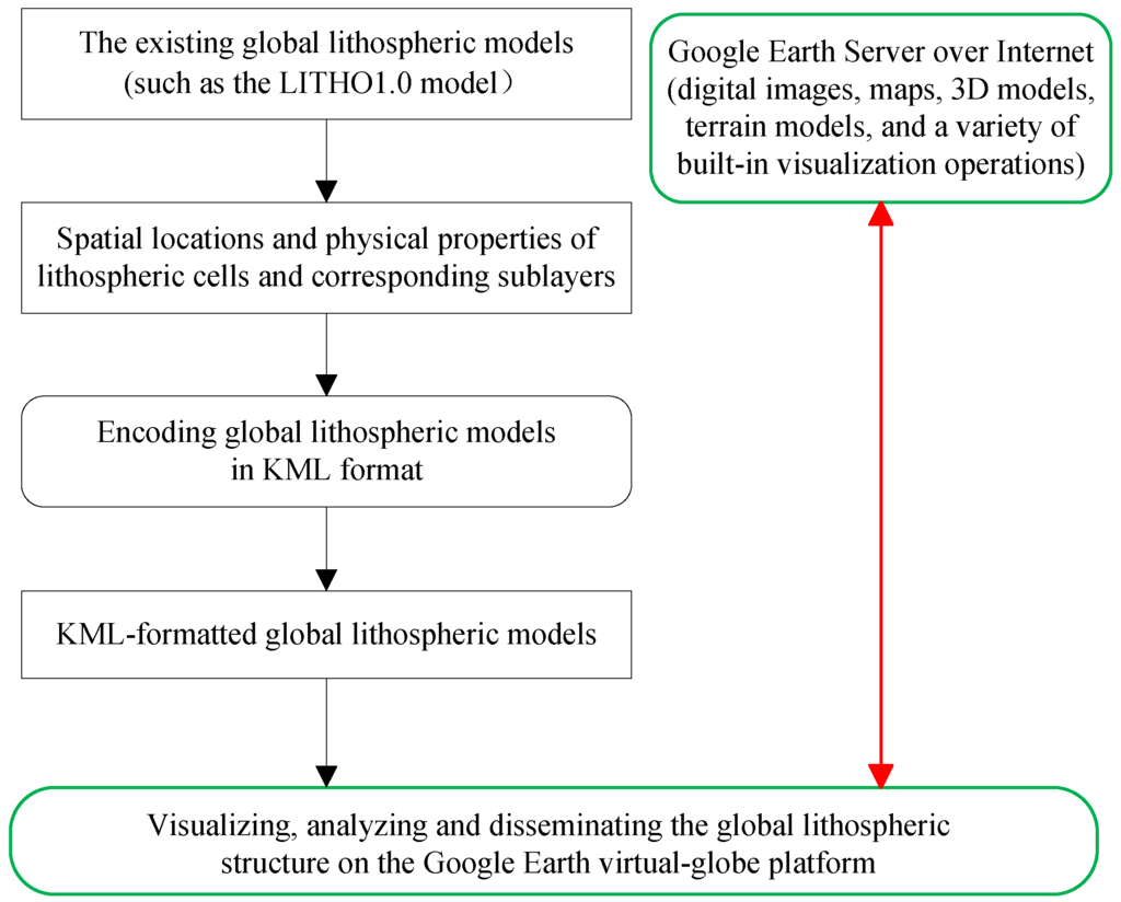 Overall framework for the representation, visualization, and dissemination of the structure of the Earth’s lithosphere on the Google Earth virtual globe platform.