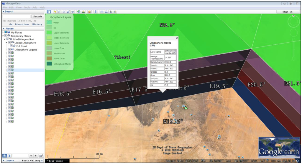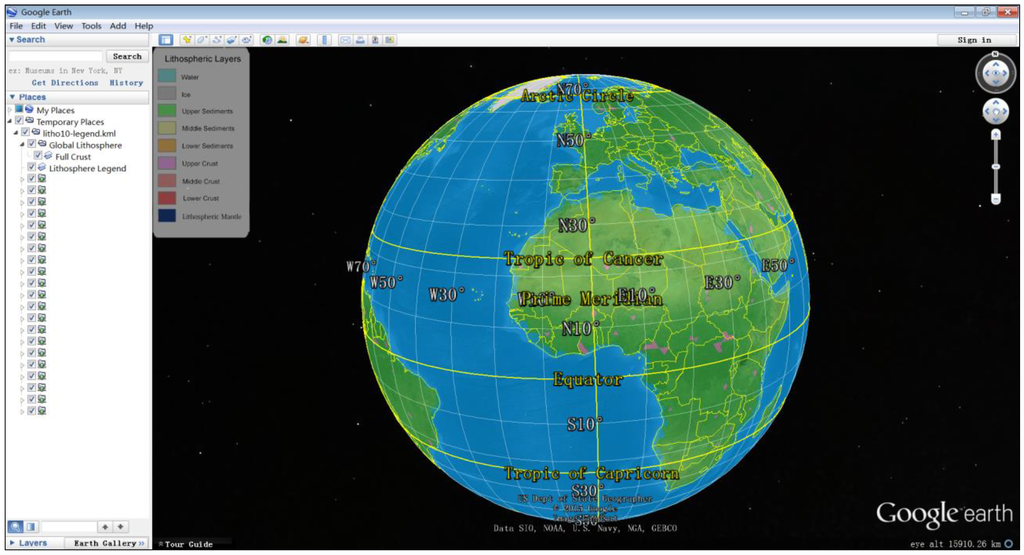 Over the years, a number of techniques have been developed to deal with multiple types of geological and geophysical data. For example, De Paor and Whitmeyer [18] presented a method through which KML, COLLADA, and JavaScript can be used to create and visualize dynamic models of the Earth’s internal structure. Postpischl et al. [19] utilized web technologies and Google Earth to address the problem of the standardization and visualization of seismic tomographic models and earthquake focal mechanisms datasets. In order to analyze seismic tomographic models, geochemical data for rocks and sediments, and geomagnetic field models on Google Earth, Yamagishi et al. [20] developed several KML (Keyhole Markup Language) generators to convert datasets of different fields of the geosciences into KML documents. Mochales and Blenkinsop [21] developed a macro-enabled Excel workbook to convert paleomagnetic datasets into KML objects, which can be visualized in virtual globes. To avoid the difficulties of subsurface rendering and touring in the Google Earth virtual globe, De Paor et al. [22] employed the surface of the Google Mars virtual globe to approximatively represent the Earth’s core-mantle boundary. Then, 3D COLLADA solid models representing crustal and mantle features can be visualized above the virtual globeʼs surface. Zhu et al. [23] presented an automatic method for the modeling and visualization of subsurface boreholes on virtual globes. However, the existing research only concerned the representation and visualization of subsurface models within local or regional areas. Up to now there are still no readily available methods for representing the global lithospheric structure derived from the existing lithospheric models on the Google Earth virtual globe. Therefore, there is a clear need to develop a universal method for the representation, dissemination, and visualization of the global lithospheric structure on Google Earth.