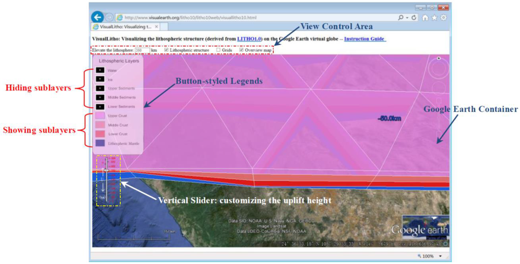 We also developed a web application, termed VisualLitho [28], for disseminating those KML-formatted lithospheric models so that anyone may visualize the structure of the Earth’s lithosphere through the Internet. As shown in Figure 5, the user interface of VisualLitho is composed of two parts: (1) the view control area, which is designed for controlling the appearance and behavior of the Google Earth plug-in, is located at the top of the webpage; and (2) the Google Earth container, incorporating two screen-overlay-based custom controls (one is a group of button-styled legends, and the other is a vertical slider), is located at the bottom of the screen. The button-styled legends can be used as interactive map keys [29] to control the visibility of individual sublayers within lithospheric cells. By clicking the button-styled legends, it is possible to show and hide individual sublayers within lithospheric cells. The vertical slider is designed to control the uplifted height value for elevating the vertical position of the lithosphere [26]. Using this control, we can manually set the uplifted height for elevating the vertical position of the 3D solid models.