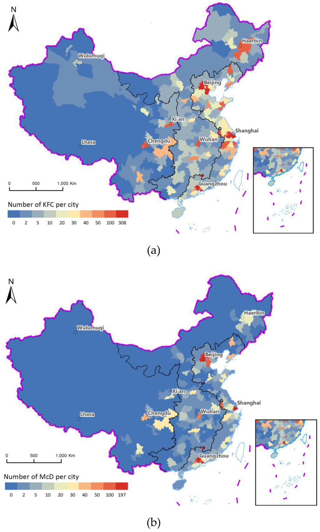 General distribution maps of (a) KFC and (b) McDonald’s outlets.