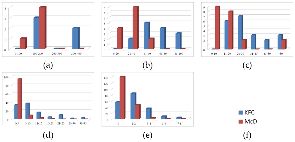Frequency distributions of KFC and McDonald’s outlets at the urban grading level for the (a) 1st-tier cities; (b) the2nd-tier cities; (c) the 3rd-tier cities; (d) the 4th-tier cities; and (e) the 5th-tier cities.