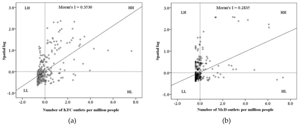 Moran scatter diagrams of (a) KFC and (b) McDonald’s outlets.