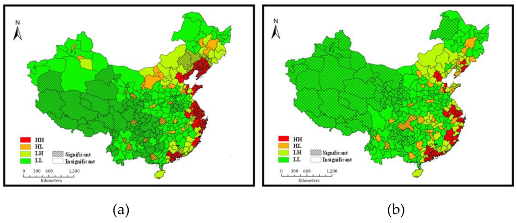 Figure 4a shows that 256 of the 337 cities are in quadrant 1 (type HH) and quadrant 3 (type LL), indicating that the spatial distribution of KFC does not have stochastic or discrete manner, but rather shows significant positive spatial correlation in the geographic space. This result is consistent with that of the global spatial autocorrelation analysis. The numerous and dense points in quadrant 3 imply that: (i) more cities have a low per capita of KFC outlets compared with a high per capita; and (ii) the low values are closer. The small number of large cities means that the points in quadrant 1 are few and scattered with obvious outliers indicating the disparity of high density values between cities. The distribution of points in quadrants 2 and 4 shows the difference between the cities and their surrounding cities. In quadrant 2 (type LH), 50 atypical cities have a low per capita number of KFC outlets but a high per capita number in their surrounding cities. Moreover, the 31 cities in quadrant 4 (type HL) are unusual in that they have a high per capita number of KFC outlets but a low per capita number in their surrounding cities.