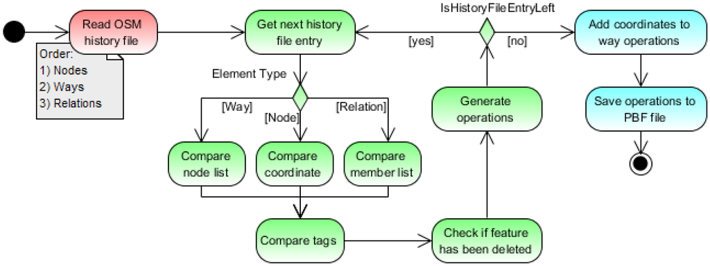 A common source to generate operation sets for mapping activities related to OSM is the OSM Full History File (http://planet.openstreetmap.org/pbf/full-history/). The OSM History lists all current and previous OSM entities (Nodes, Ways and Relations) with all versions back to the launch of the OSM project. For analyzing up-to-minute data, it is possible to add the latest data from the minutely, hourly or daily Changesets. Entities are ordered by type (Nodes first, than Ways and Relations), unique identifier and version in ascending order. In other words, the history file represents all historical versions of OSM database entries as time series, but does not represent changes between two consecutive versions of the same entity. Thus, operations have to be generated by comparing two consecutive versions of one entity. This task has to be repeated for all versions of all entities. Figure 4 outlines the overall workflow for extracting operations from the OSM Full History File.