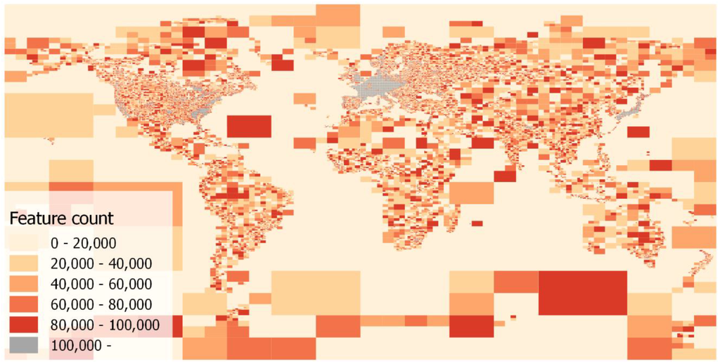 Figure 5 shows the quadtree structure for the operations generated from the September 2015 OSM Full History File. The colors indicate the number of features within a quadrant. Light colors mean that only a few features are stored within the quadrant while dark colors indicate a high number of features (up-to 100,000). If more operations are added to the quadtree, dark-colored quadrants would be the first candidates to be subdivided into sub quadrants. Grey-colored quadrants (as in Europe, Japan or Eastern USA) contain already more than 100,000 features and therefore may not be sub-divided again. The quadtree structure has been preferred over a grid structure due to the unequal distribution of operations (e.g., in sparsely populated areas like oceans or deserts). The access of many files with a low number of features would result in a poor reading performance.