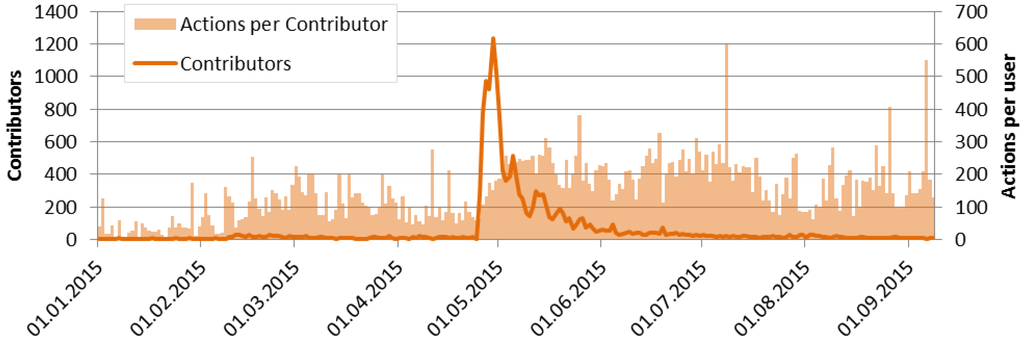 Contributor analyses are also a suitable measure to analyze mapping activities being coordinated by specialized VGI communities like the Humanitarian OSM Team (HOT) (https://hotosm.org). HOT has developed as a major community effort in the context of crisis mapping. Typically, HOT starts its mapping efforts immediately after a (environmental) disaster. Volunteers help in mapping streets and other features in the affected region following the goal to provide actual and complete map data for rescue teams. On 25 April 2015, the country of Nepal was hit by a major earthquake. Immediately after the earthquake, HOT started an initiative for improving OSM data in Nepal. The success of this effort is shown clearly in Figure 6 detailing the number of daily contributors as well as daily actions per contributor in Nepal before and after the earthquake. The contributor statistics has been derived by using the proposed framework with a spatial filter around the Nepalese border including all feature types. The figures not only show a significant increase of contributors immediately after the earthquake, but also a significant increase of actions per contributor. Interestingly, although the number of contributors continuously decreased after the earthquake, the number of actions per contributor remained on a higher level than before the earthquake indicating that still a few people are responsible for a majority of the mapping activity. In total, 8176 contributors contributed 2,683,393 actions to the crisis mapping effort after the earthquake. Of those, 5598 (68%) had not edited the map before. Calculating the number of contributors and actions for all feature types for the whole country of Nepal took eight minutes processing time.