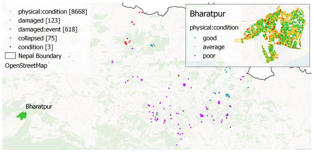 The map reveals that the affected building features are widely distributed. While features with the attribute damaged:event occur in all affected regions, features with the attributes collapsed or damaged are rather concentrated. The attribute physical:condition has only been collected by three contributors in the city of Bharatpur which is highlighted in Figure 7. The detailed map also visualizes the condition level (good, average, and poor). The analysis clearly demonstrates that the goal of post-earthquake mapping with respect to building conditions has not been met, although companies offered post-earthquake satellite imagery showing destroyed buildings (https://www.mapbox.com/blog/nepal-earthquake-imagery-0427/). One reason could be that so far there is no accepted proposal on how to model building conditions in OSM.