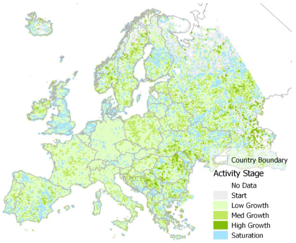 A predominant question in the context of VGI is concerned with quality assessment. Although in the past the majority of quality assessments have been based on comparisons of VGI datasets with other datasets, intrinsic assessments have recently gained attention [17]. In [20] it has been demonstrated that an estimation of the completeness of a dataset could be derived from an analysis of the community activity over time periods. This estimation classifies the mapping progress of a raster cell or region in three activity stages, namely “Start”, “Growth” and “Saturation”. The mapping activity itself (number of created features in a certain time period) is responsible for transitions between different stages. After the initial stage (“Start”), the “Growth” stage indicates that contributors have mapped the majority of the features during this period. A respective region proceeds to the final stage (“Saturation”) when the number of created features per year drops under a pre-defined threshold (less than three percent of total count). Saturation means that most of the mapping, with respect to a selected feature type, has been completed. From a technical point of view, Ac Create and Ac Delete actions have to be analyzed in order to determine the increase/decrease of features within the raster cell and the given time period. Actions are filtered by feature type (e.g., street), a pre-selected raster (e.g., grid, hexagons or administrative boundaries) and time period (e.g., year 2014). For efficiently executing the analyses a separate analysis process for each raster cell is started. Therefore, the analysis task is well suited to be massively parallelized. The spatially indexed PBF files are used to read the data for one raster cell efficiently. As the same or nearby quadrants are analyzed in a consecutive way, the data in lower quadrants is kept in cache to avoid frequent file reading which speeds up the process (up to 25% time saving). With this measure, analyses for large regions (e.g., countries or continents) and several time periods could be completed within short time frames (between five seconds and four minutes for hexagons with a diameter of 20 km, duration depends on number of features within region). Also, continuous worldwide estimates (e.g., on a daily basis) are feasible. As an example, Figure 8 shows the activity stages for the feature type street in Europe by the end of 2014. While most parts of Europe still show low to high growth, the mapping progress is already saturated in Great Britain, Denmark, the Netherlands as well as some areas of Northern and Eastern Europe. The figure also reveals the highest feature growth in the eastern parts of Europe.