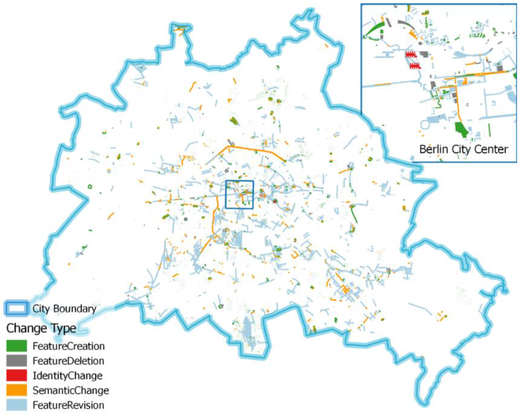 As proposed in previous work [22], a classification of changes according to five change types (Feature Creation, Feature Deletion, Identity Change, Semantic Change and Feature Revision) helps in separating relevant from irrelevant changes. Figure 10 shows a map of the city of Berlin highlighting changes by different change types. One prominent example for a changed identity happened with the Paul-Löbe-Haus in Berlin (large red polygons in Figure 10). As the detailed map of Berlin’s city center shows, this building has been moved significantly, which resulted in a “changed identity” classification. As this has been obviously an erroneous mapping (since the building has not moved in reality), the building has been “virtually” moved back to its original location two days later. This example is well-suited proof for the necessity of change detection as well as qualitative classification.