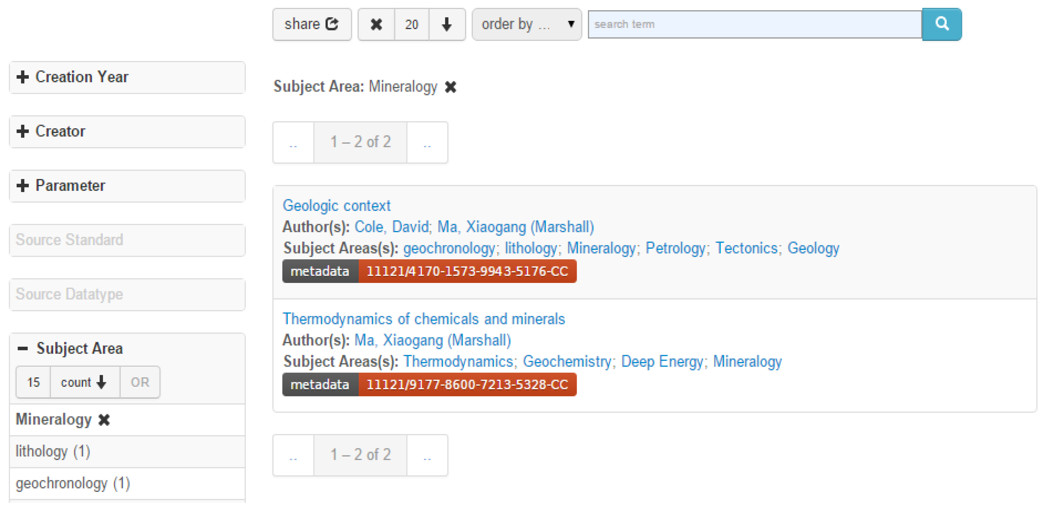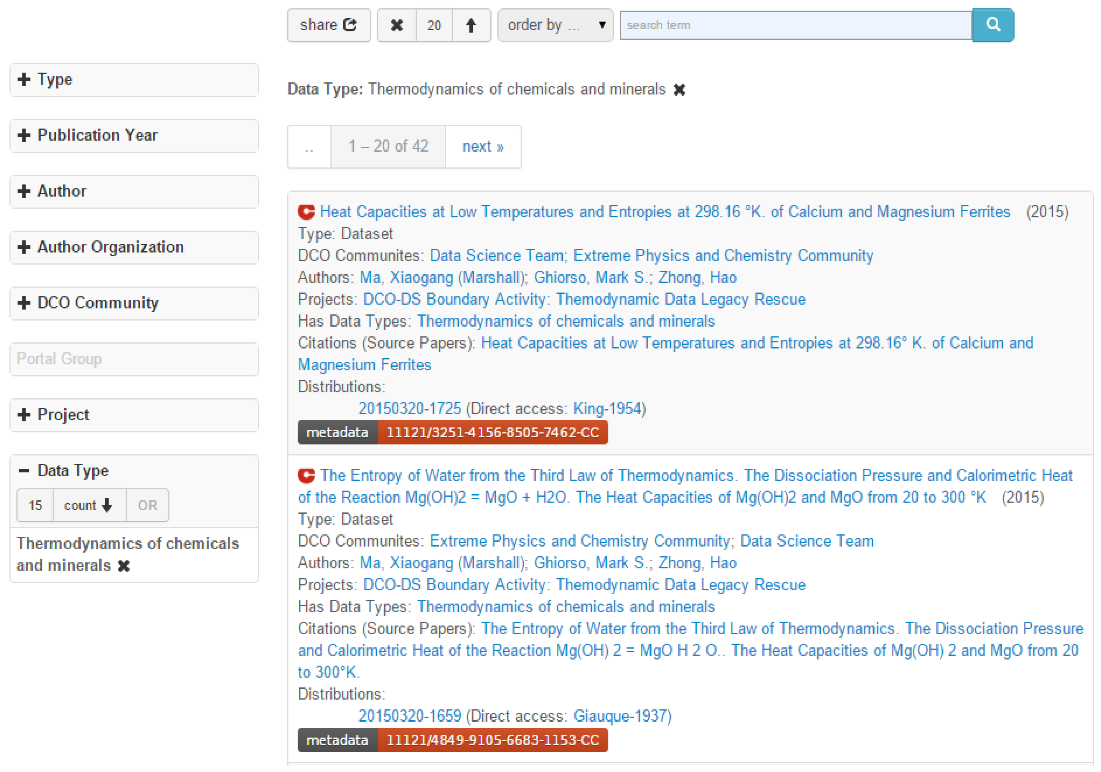 Figure 4 shows a part of returned datasets when “Thermodynamics of chemicals and minerals” is selected in the data type facet.