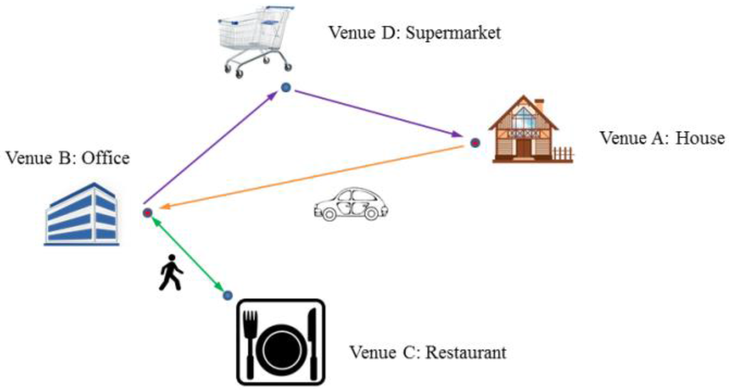 In this section we will introduce how to use check-in information to depict human mobility and spatial interaction patterns. Within location-based social networks such as Foursquare, each venue corresponds to a physical location (see Figure 1). Common types of venues include restaurants, offices, apartments, hotels, bus stops, shops, and gyms. Imagine a user checks in at venue A (house) and venue B (office) consecutively. In this situation, the “trip” is from venue A to venue B, irrespective of the specific route taken by the user travelling between these two venues. In the context of this study, a “trip” is a single journey represented by a line in geometrical terms. Sometimes, a user might travel twice between two venues in opposite directions, e.g., going from an office to a restaurant for lunch and then returning after lunch. If a user travels between two venues, these two venues are considered to be “spatially interacted”, in other words, there is an “interaction” between these two venues.