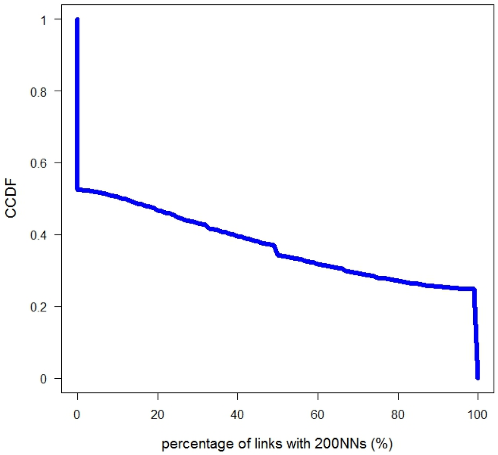 Complementary cumulative distribution function (CCDF) of percentage of links a venue has with KNNs.