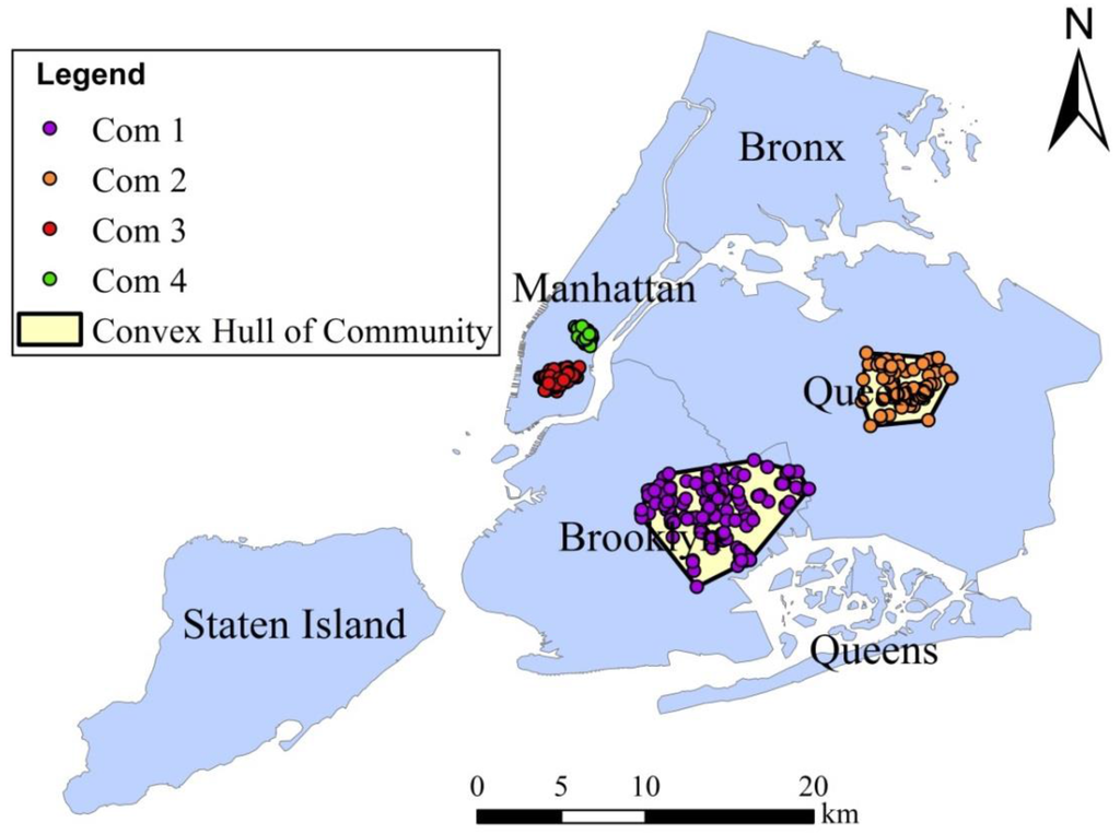 The four community detection algorithms were all used to identify clustering of local interactions (area of high dense interactions). Among the four partitions of the network, the partition made by using the Walktrap algorithm was selected as the best partition for this study since the number of communities detected is the smallest. The spatial interaction network in NYC was divided into 1515 communities by using the Walktrap algorithm. The majority of the communities have a small number of intra-community trips and nodes. Among the 1515 communities detected, only four communities have more than 500 intra-community trips and 100 nodes. In this case, typical communities were further selected for analysis of clustering of local interactions. Typical communities have a large number of intra-community trips (more than 500 trips), and a ratio of more than 20 for the number of intra-community trips and number of inter-community trips. The four most typical communities, which in total have 790 venues and 3778 intra-community trips, were selected since they contained only 6% of the total venues but 16% of the total trips. This indicates the heterogeneity in spatial distribution of “local” interactions.