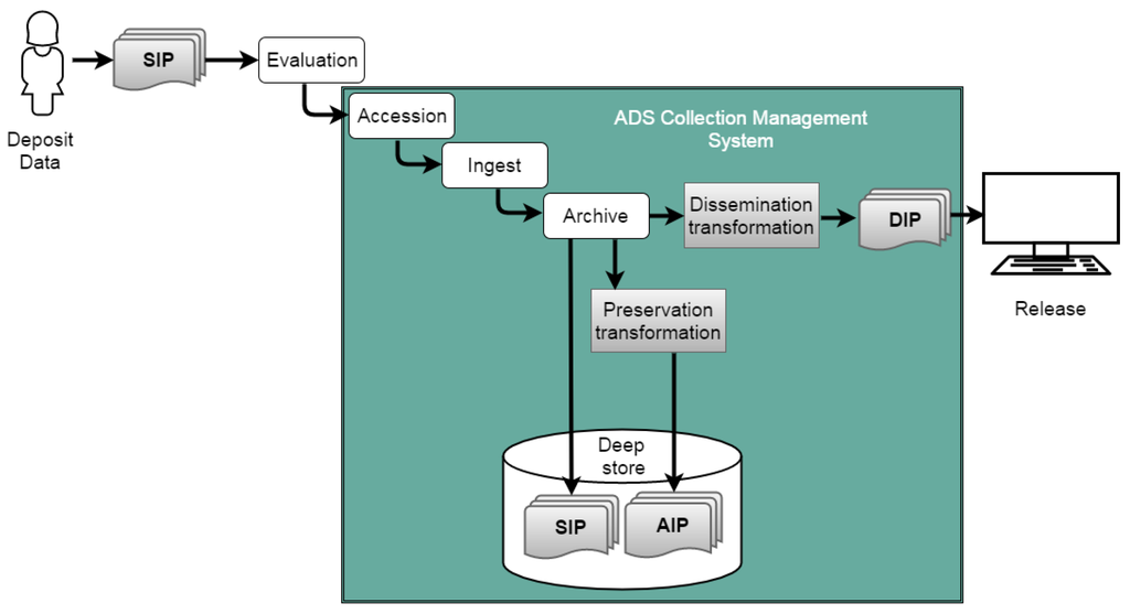- Archival Information Package (AIP): Data generated from the SIP and transformed into a long-term preservation package managed within the OAIS, including administrative, technical and re-use documentation.