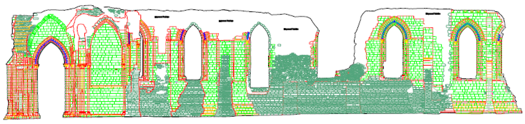 Representation of a two dimensional Computer Aided Design (CAD) file held in the ADS archive depicting the south elevation of the choir aisle’s south wall of Glastonbury Abbey [16] © Trustees of Glastonbury Abbey.