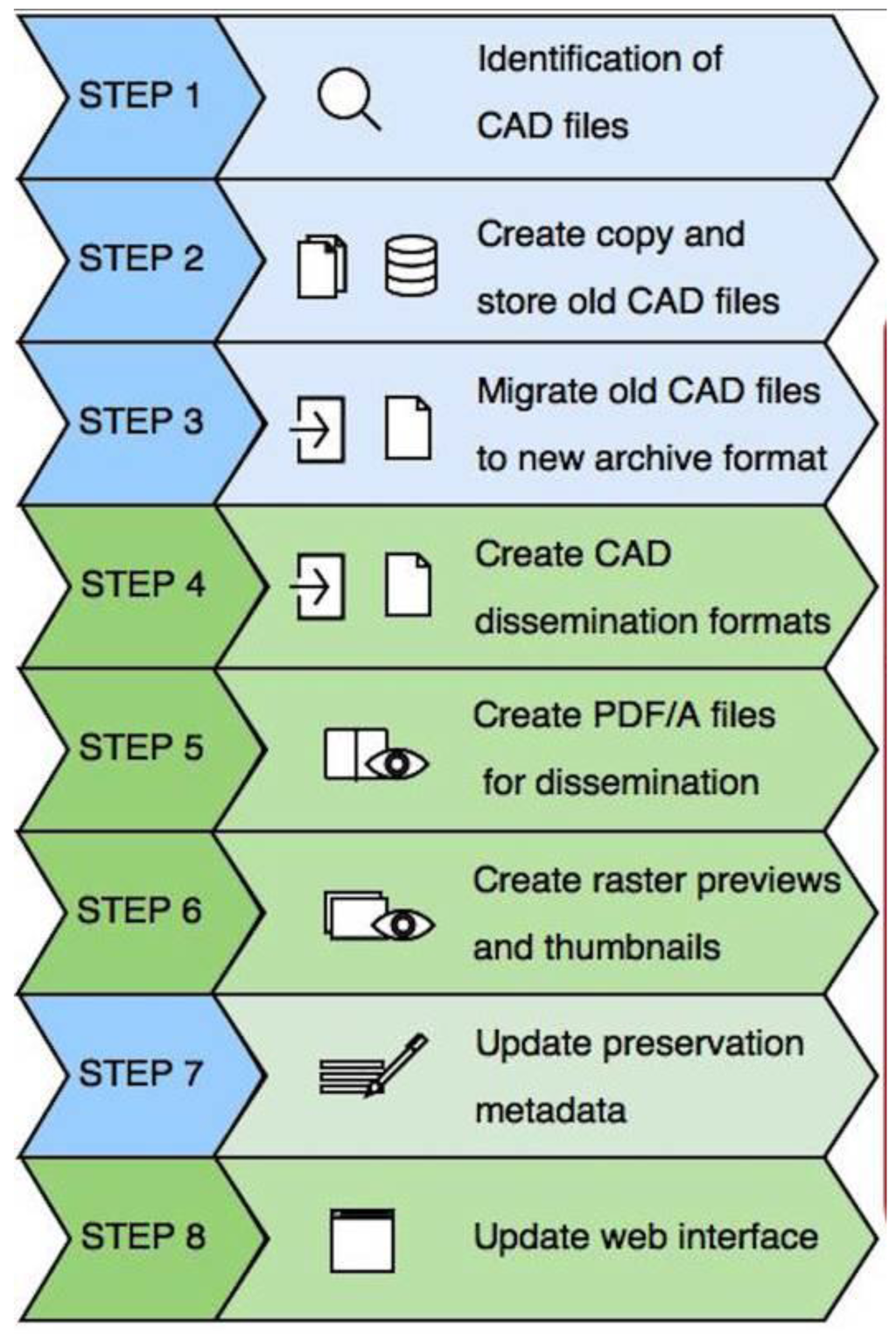 Workflow diagram of the ADS’s CAD migration process. Blue highlights steps taken to ensure long-term preservation, green highlights steps taken to enhance the dissemination of data.