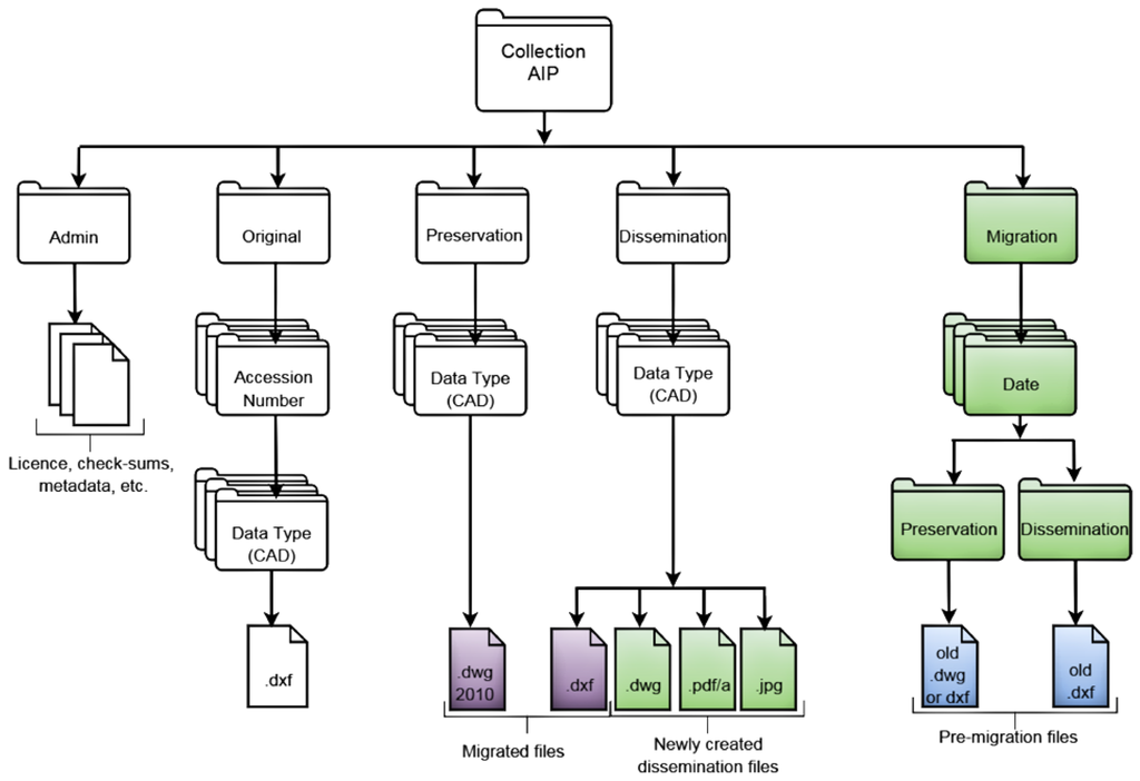 Step 2: Removal and storage of original preservation and dissemination versions of files. A key element of the migration strategy was that while the archived CAD datasets were largely to be updated, no data was to be removed or deleted from the archive. In practice this meant that any preservation or dissemination versions of data that were to be replaced were copied to a new “migrated” location within the collection prior to the migration process (see Figure 6 for an example of a collection AIP file structure). As the majority of data migrations are carried out on the existing preservation datasets, this process aims to preserve these as intermediate datasets between the original SIP data and the new, migrated AIP data. Although, as described below, this wasn’t always the case in the ADS CAD migration process, these datasets were kept to provide a “history” for how the CAD elements of each collection had been preserved and disseminated.