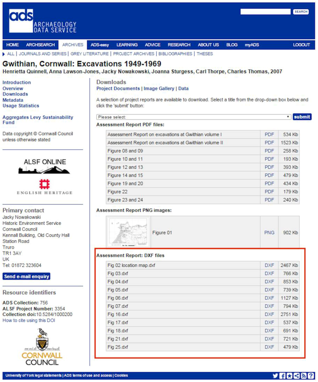 - Archaeology Data Service. CAD and Vector Images. Available online: http://archaeologydataservice.ac.uk/advice/FilelevelMetadata#section-FilelevelMetadata-CADAndVectorImages (accessed on 25 November 2015).