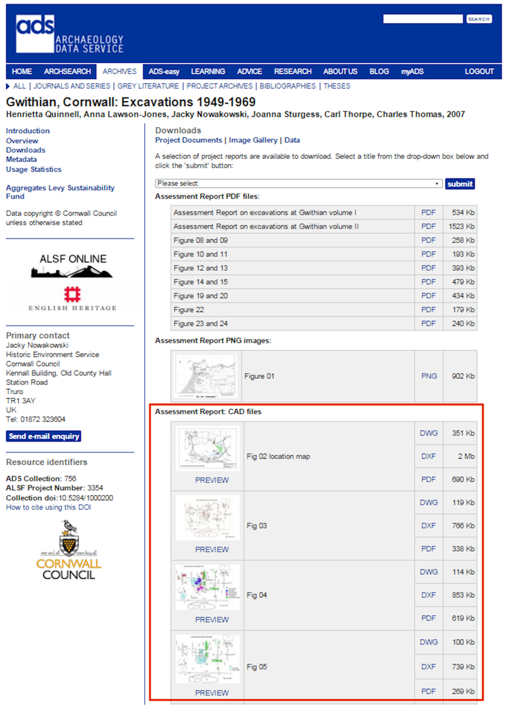 In addition to the migration of the archived CAD datasets, the proposed digital migration of CAD files at the ADS would also involve updating the dissemination versions of these files. Previously all CAD data was disseminated as individual downloadable DXF files (the same format that was stored within the AIP). As part of this process it was decided that the ADS should also aim to increase the accessibility and re-use potential of CAD datasets through the dissemination of both AutoCAD 2010 DWG and DXF files alongside additional Portable Document Format (PDF) files, preview images, and thumbnails of the drawing’s layouts. While the migration of CAD data in existing AIPs was a “behind the scenes” task, that primarily served the long-term preservation needs of the ADS, the updating and enhancement of the dissemination versions of the data in the DIPs created a separate thread of migration work that directly impacted on the user-facing side of the ADS website.