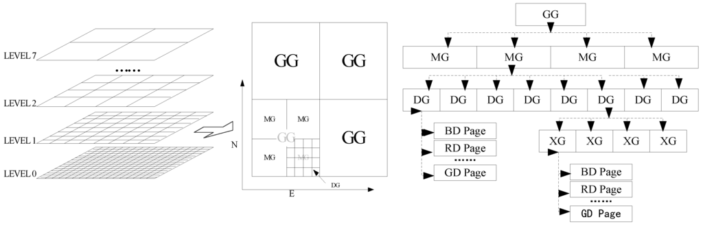 Spatial data using the CNDF model are clustered by multi-scale grids. All of the grids are indexed by the multi-scale grid (MSG) index. The MSG is made up of groups of level grid indexes (LG) and each LG manages data at a specific scale (Figure 1). LG is a variant Quad-tree [9]. The grids of LG are divided into four varisized ranks, including a general grid (GG), middle grid (MG), detailed grid (DG), and extended grid (XG). The width (or height) of the grid within the same rank is equivalent. DG is the leaf nodes of LG, and spatial data at a specific scale are clustered into pages by DG. In some places, the data size may overflow, for example, the CBD in large cities. In this case, MSG allows DG to be further partitioned into smaller XGs. For spatial queries, the addresses of target pages can be found by searching the path from GG to DG (even to XG) that cross by query bounds.