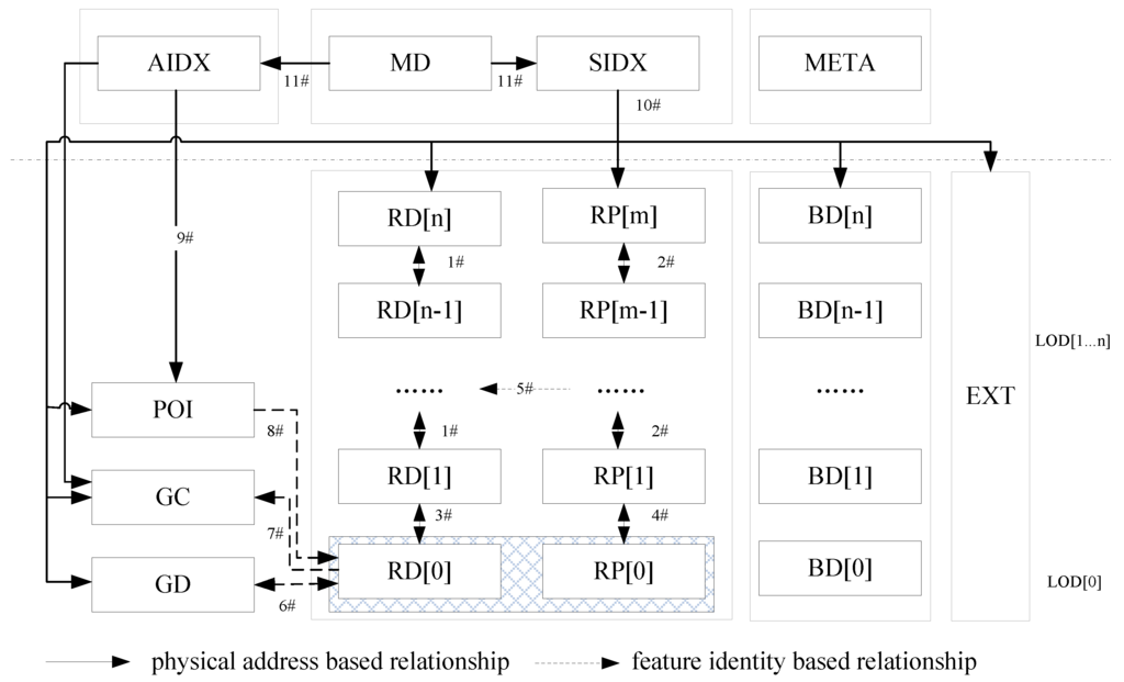 Figure 2 illustrates the logical structure of the CNDF model. The spatial data using the CNDF consist of multi-level background data (DB), multi-level road data for display purposes (RD), multi-level road data for route planning (RP), driver guidance data (GD), geocoding data (GC), and land mark data (POI). The management data include the volume manager data (MD), spatial index (SIDX), and attribute index (AIDX).