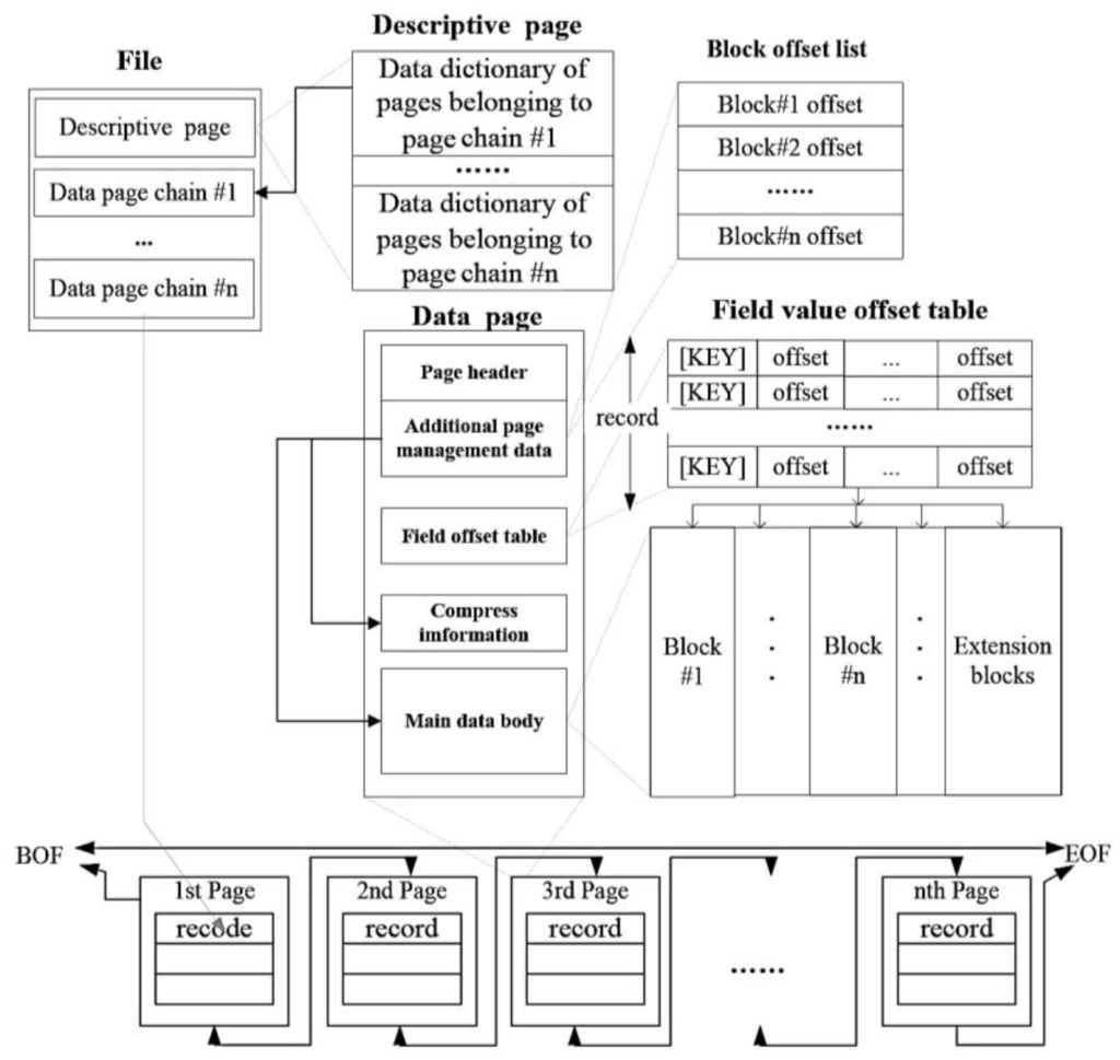Pages are comprised of a page header and several blocks. The page header records necessary information pertaining to the page structure, including the compress flag, block number, and block offset from the beginning of the page. The page header also assigns two address pointers, used to save the previous page and the resultant page. In this way, all pages form a chain, optimizing page insertion under the restriction of maintaining the record order. The first block of the page is the offset table, used to store the offset of each field. The table is updated correspondingly when the field is lengthened. Records in the CNDF are in row order, which is different from other PSFs. Records in row order can avoid the reading of unnecessary fields into the memory. In CNDF, the page size is limited within MPS to 128 KB.