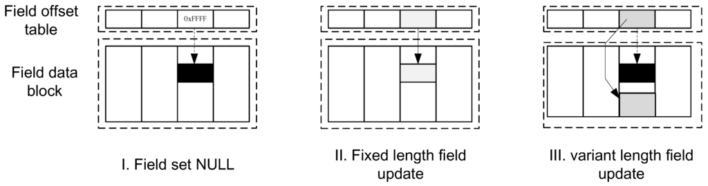 A real-time data update mainly invokes a field update (Figure 5). In most popular page-based models, the length of the field is generally fixed. For a field with fixed length, it only needs to refresh the value of the selected field in the record pointed by the offset table in the page. However, a different strategy is adopted for fields with variable lengths. If the field length exceeds the current field length after the field update, the updated field will be appended to the tail of the right block and the offset table will also be refreshed. In the offset table, “OxFFFF” is a prescriptive tag, representing the field with NULL value.