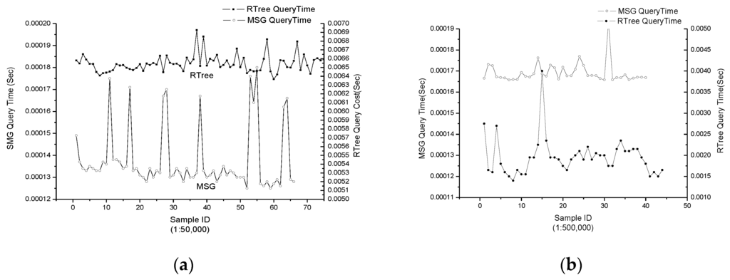 MSG is suitable for a navigation system for three reasons. First, MSG is compact, which does not need to ensure a minimum rectangle boundary (MRB) in leaf nodes (DG or XG). The grid width (or height) of each rank can be calculated by the reference grid (the lowest level DG) using Equation (1). Secondly, MSG is a high performance index. It regulates β denoted by 2n (n ≥ 0), which avoids the float point operation for a spatial query. Further, MSG is close to being balanced. Finally, MSG has a large capacity index. Suppose M represent the capacity of a single LG, where Μ = α2 × β2 × γ2 × max page size (MPS). If MPS = 64 KB, and α = β = γ = 16, then M = 1 TB. Therefore, the capacity of MSG is sufficient to manage spatial data covering vast areas.