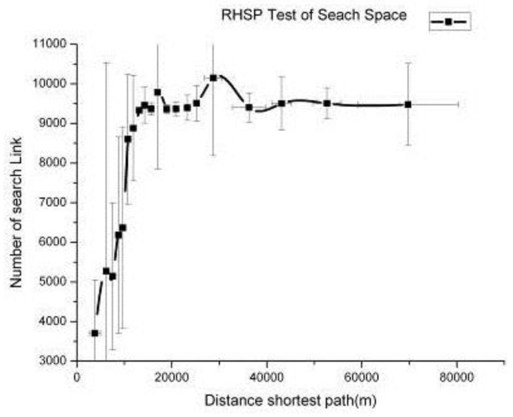Based on the reach-based hierarchical network, the RHSP algorithm was run iteratively using input start nodes with various distances to the end node. The number of links inserted to the heap was recorded. Results show that the average number of searched links was limited to 11,000 after running 1000 times (Figure 8). This indicated that the reach-based hierarchical network was effective to control the space bound of the route search and constraint the computing time to a nearly constant value.