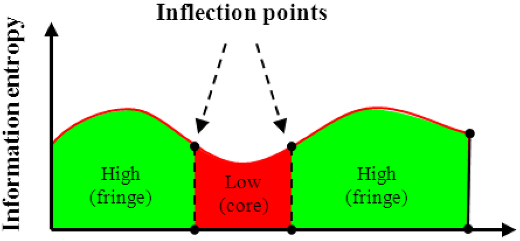 Sixth-degree polynomial fittings are conducted for the entropy values (z) for cells in different rows (latitude direction) and columns (longitude direction) (Equation (4)). Subsequently, inflection points (where second order derivative equals to zero) for individual rows and columns are obtained. As shown in Figure 2 and Equation (5), the convex part(s) between two inflection points is the high entropy value part, and the remaining concave part(s) between two inflection points is the low entropy value part, representing the urban fringe area and core area, respectively.